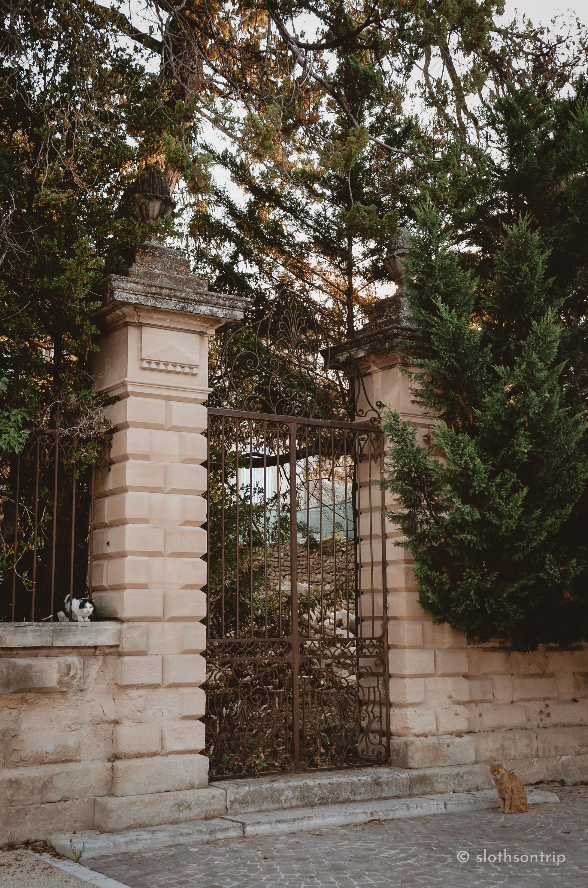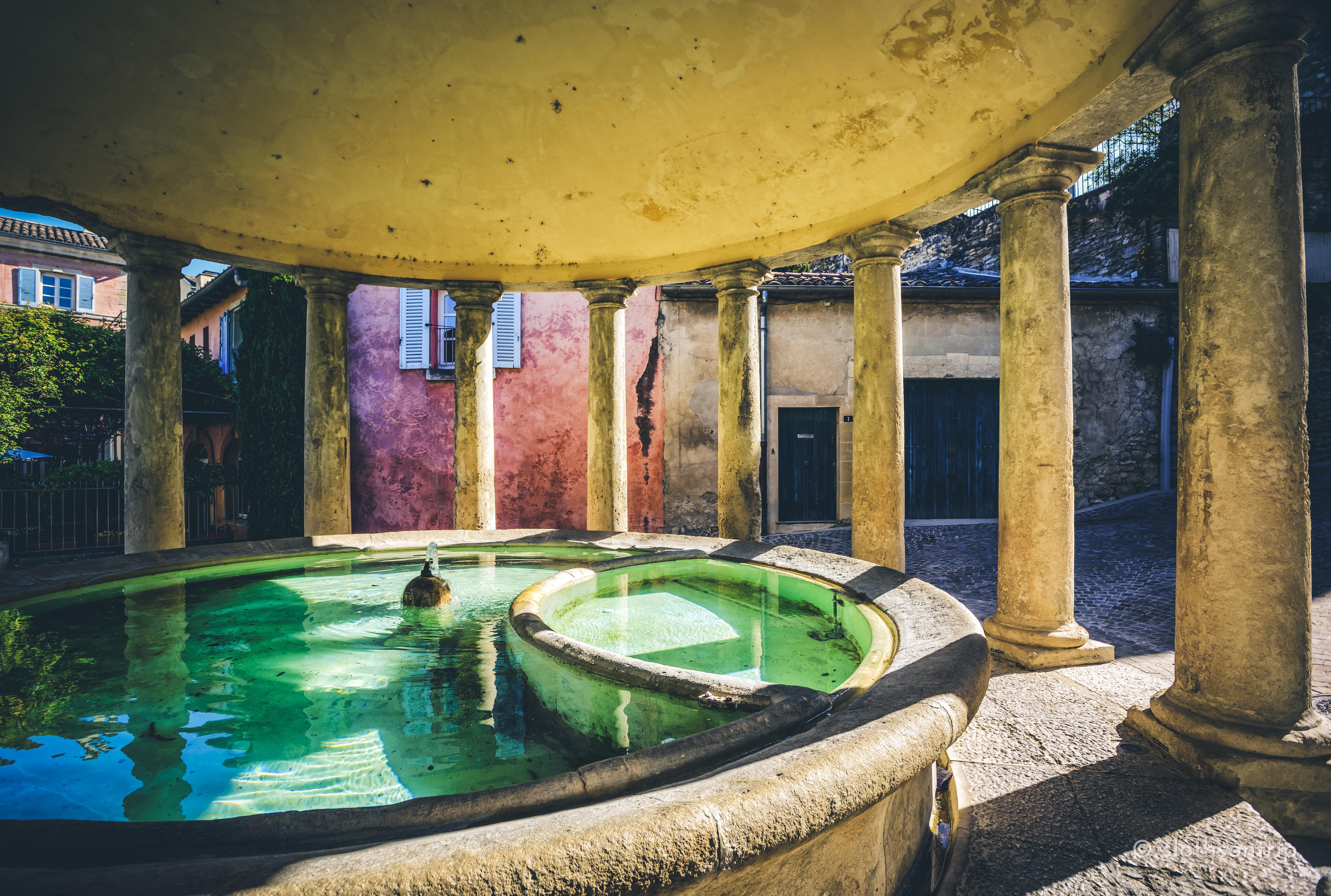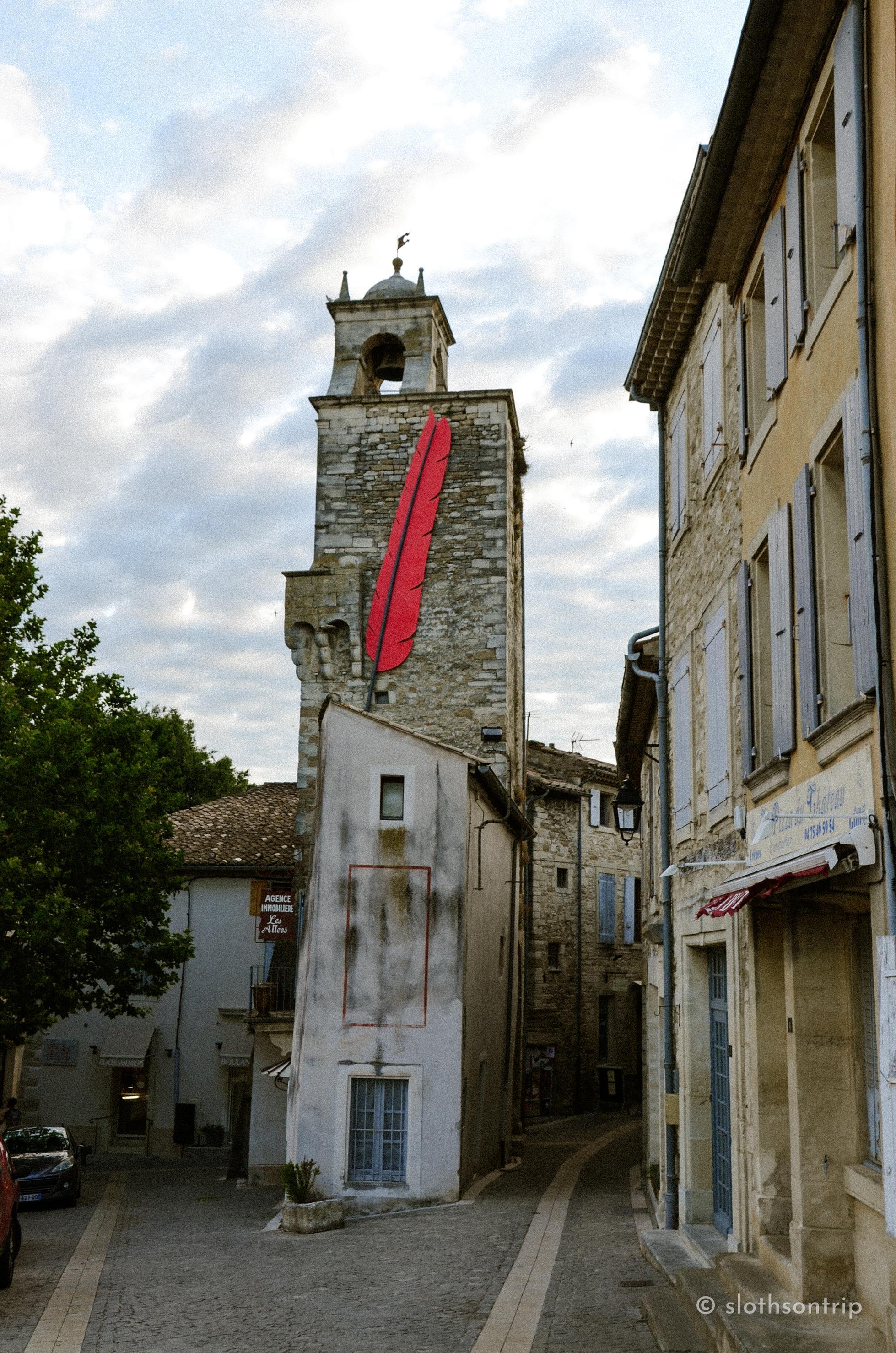 Kamienne bramy i żelazne furtki prowadzą do cichych ogrodów, a koty – jak ten rudzielec pod murem – są prawdziwymi gospodarzami miasta. W centrum stoi stara fontanna, przy której toczy się codzienne życie. Wąskie uliczki z pastelowymi fasadami i drewnianymi okiennicami prowadzą w stronę kościoła Saint-Sauveur i zamku – najbardziej rozpoznawalnego punktu Grignan. Jego strzeliste wieże widać już z pól lawendy na południe od miasteczka, skąd Grignan wygląda najpiękniej: kamień, zieleń i fiolet w jednym kadrze.