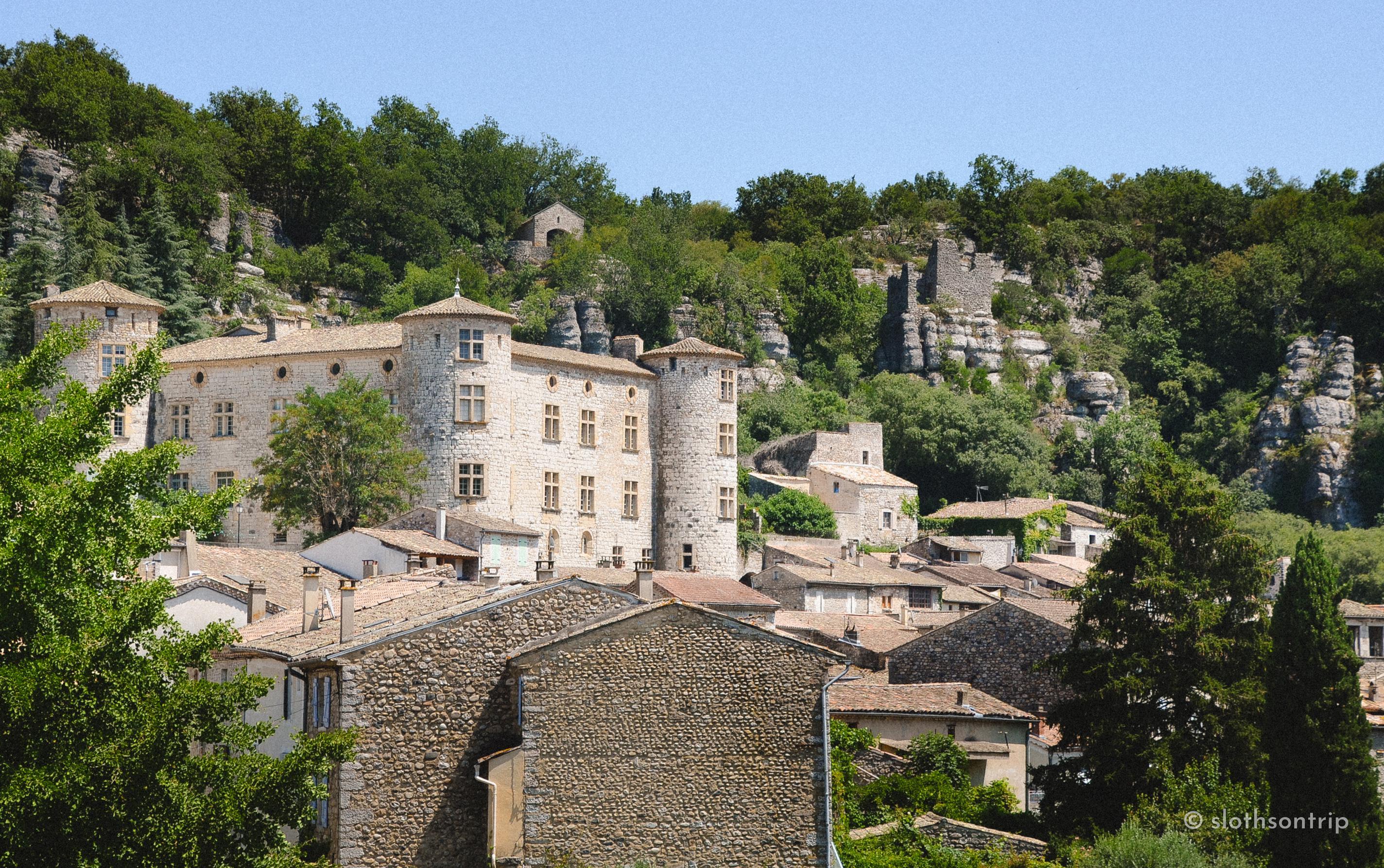Zamek wzniesiono w XI wieku, a jego obecny kształt pochodzi z okresu renesansu. Przez stulecia był siedzibą potężnego rodu Vogüé, związanego z dworem królewskim Francji. W czasach rewolucji francuskiej został częściowo zniszczony, a następnie odrestaurowany przez potomków rodu. Dziś zamek pełni funkcję muzeum i galerii sztuki, w której prezentowane są wystawy czasowe lokalnych artystów. Z tarasów rozciąga się bajkowy widok na miasteczko i dolinę Ardèche. W Vogüé każdy krok prowadzi przez historię – od romańskiego kościoła z kamienia, przez łukowate przejścia, aż po pastelowe drzwi, za którymi toczy się zwykłe życie.