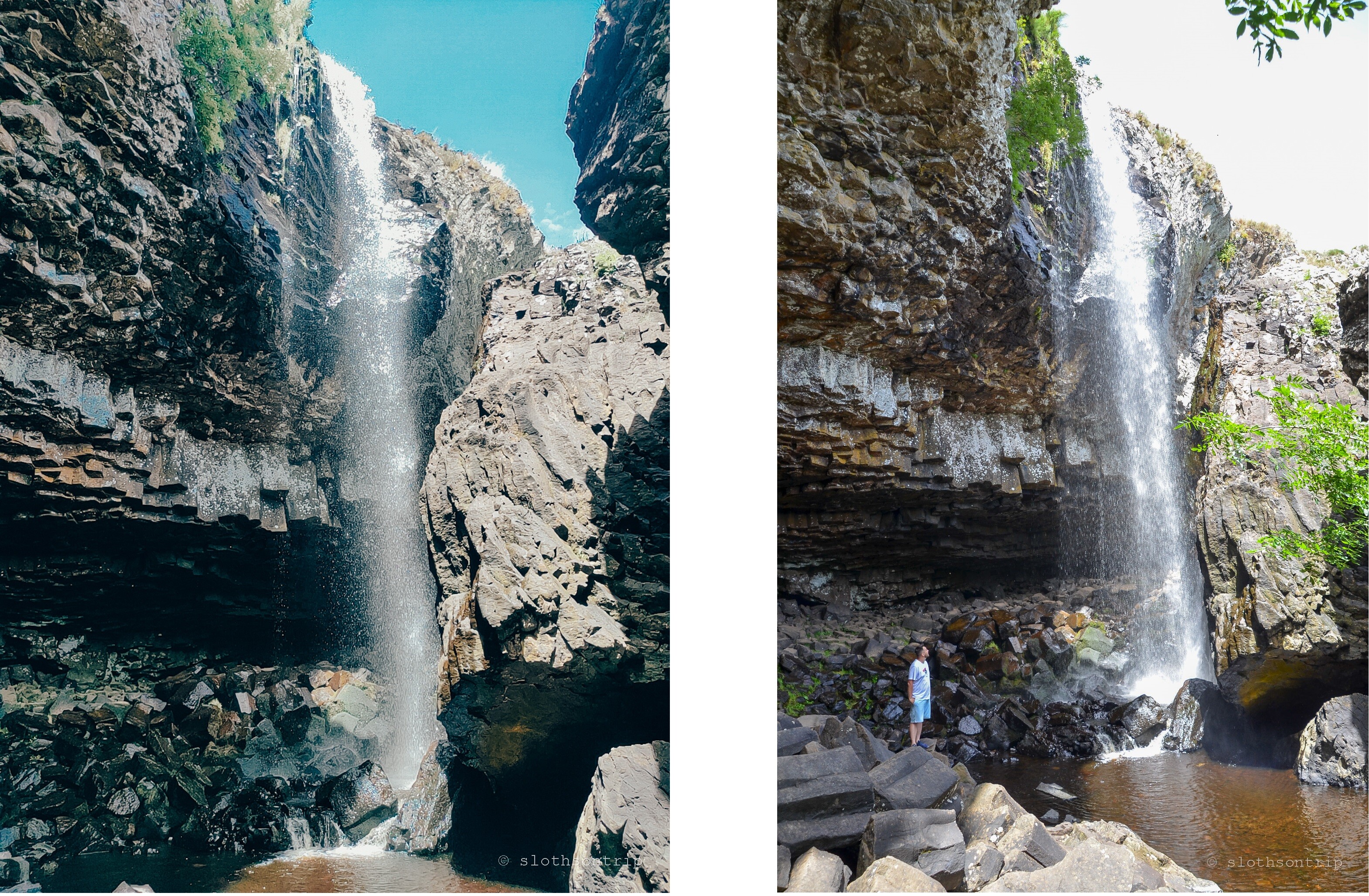 It's best admired from the level of the cave adorned with basaltic columns, enhancing its natural beauty.