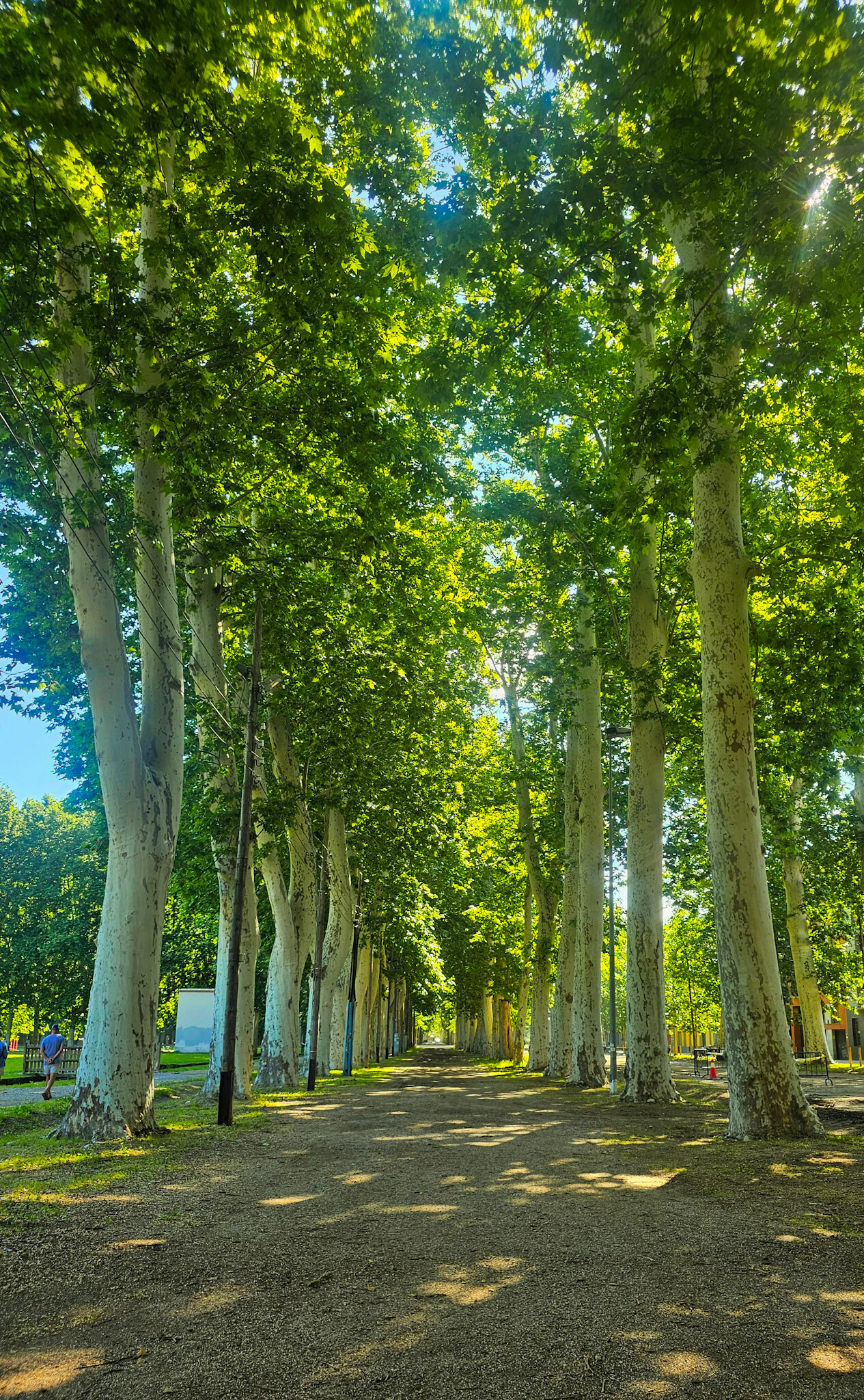 Hotel mieliśmy praktycznie przy Parc de la Devesa, więc start dnia był aż za prosty. Wychodzisz i od razu jesteś w zielenej oazie chroniącej przed upaem, wysokie platany, cień, zero pośpiechu. To dobre wejście w Gironę, bo zanim trafisz w kamień i stare mury, masz chwilę luzu i przestrzeni.