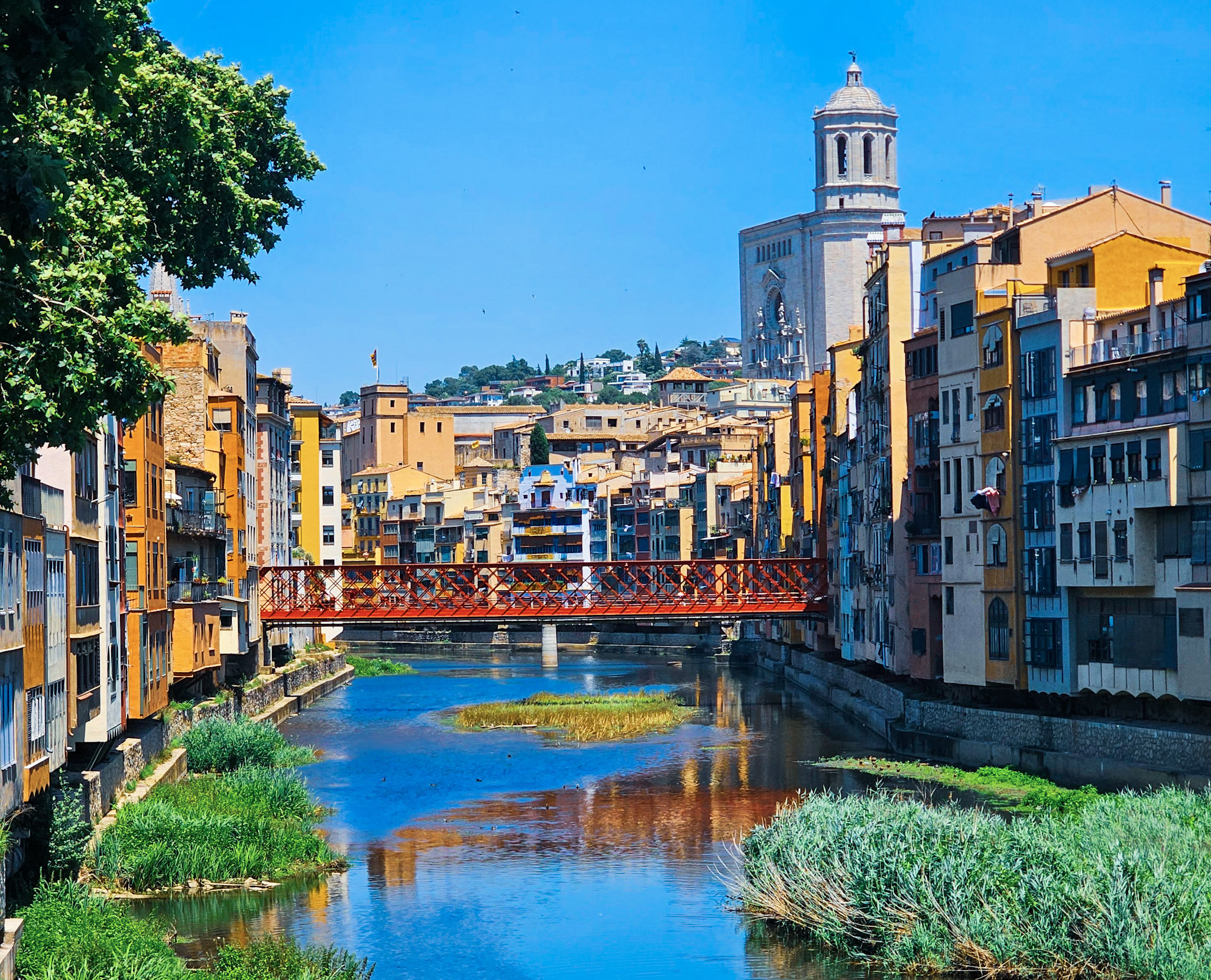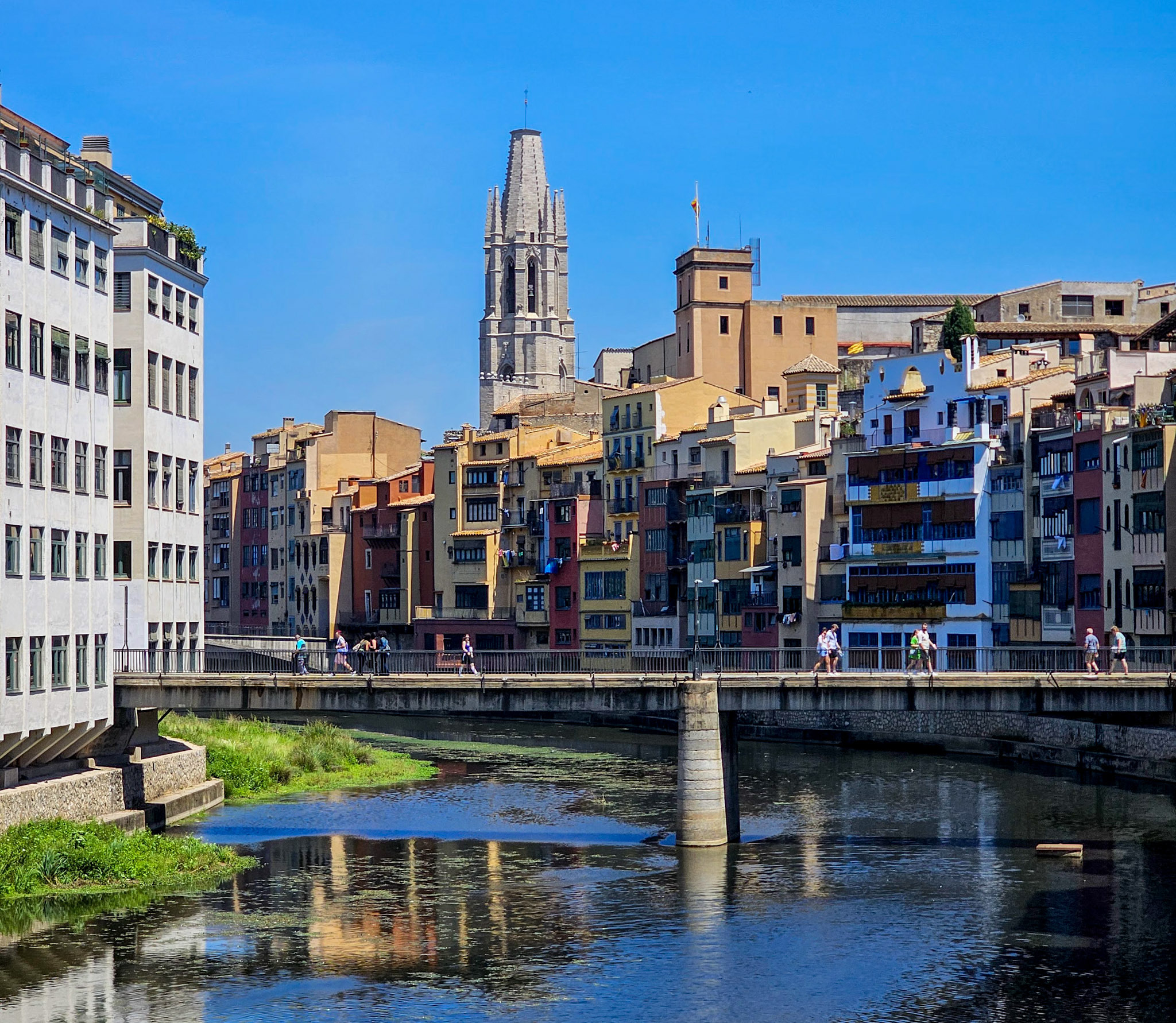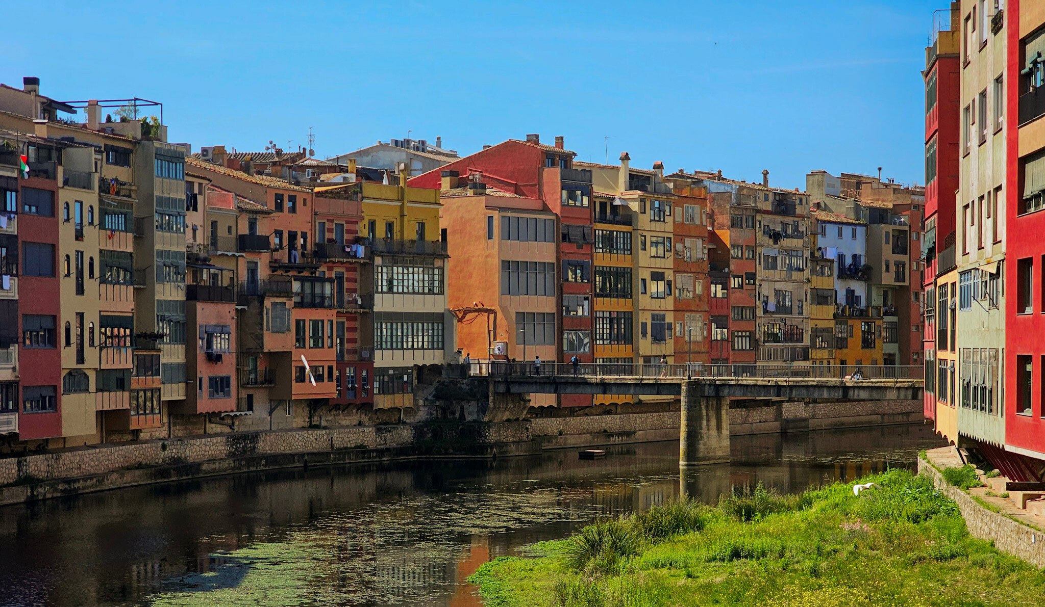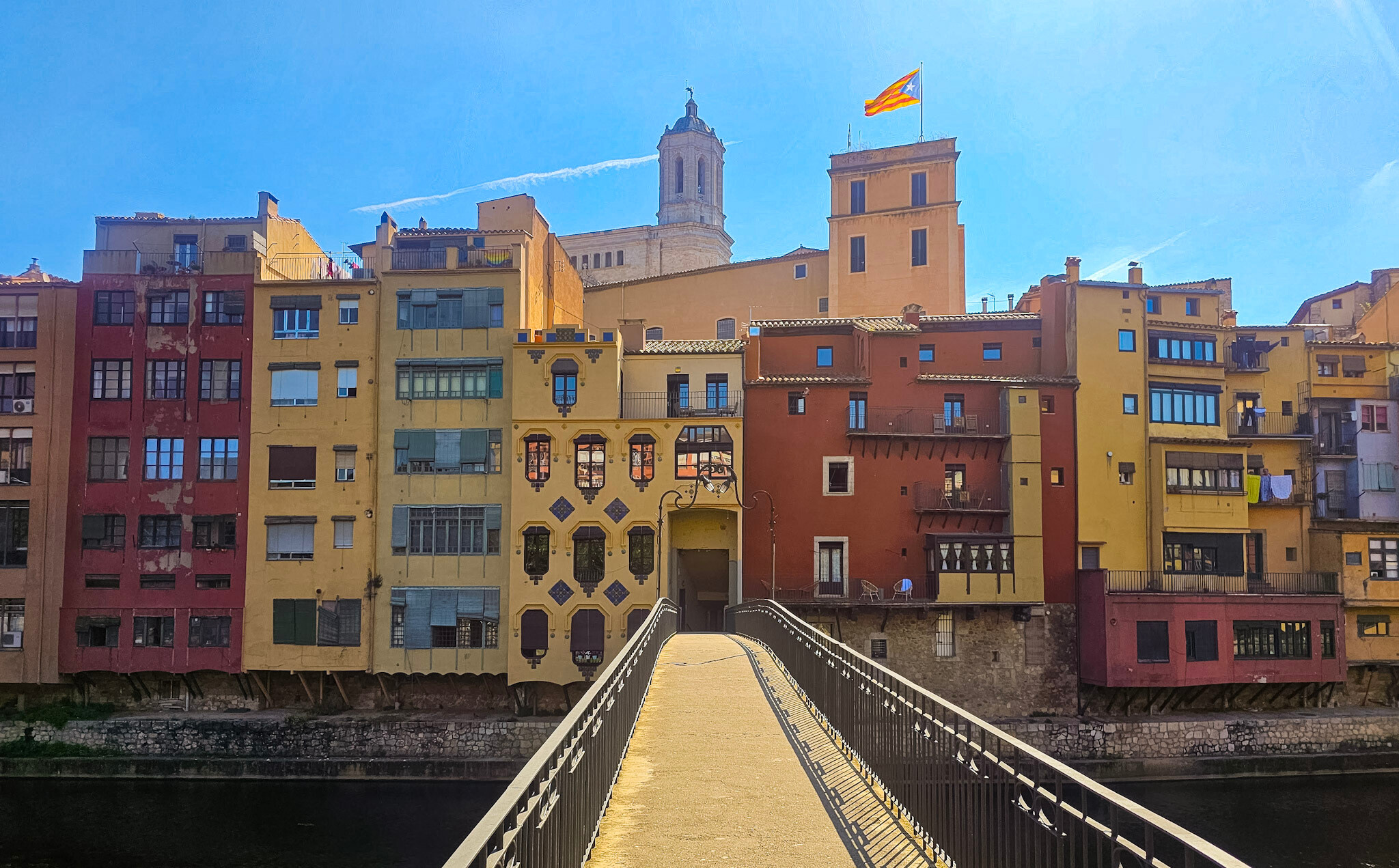 Za parkiem szybko dochodzimy do rzeki Onyar, gdzie Girona pokazuje swoją najbardziej charakterystyczną twarz, kolorowe domy stoją tu praktycznie nad samą wodą. Ich fasady są nierówne, trochę „posklejane”, ale właśnie to tworzy klimat, który można zobaczyć na pocztówkach, a w tle ponad dachami wyrasta wieża katedry. Dawniej były to zwykłe kamienice rzemieślników i kupców, dziś są jednym z symboli miasta. Przechodzimy przez wąski most, który prowadzi prosto w stronę starego miasta i daje jeden z najlepszych kadrów na całą zabudowę.