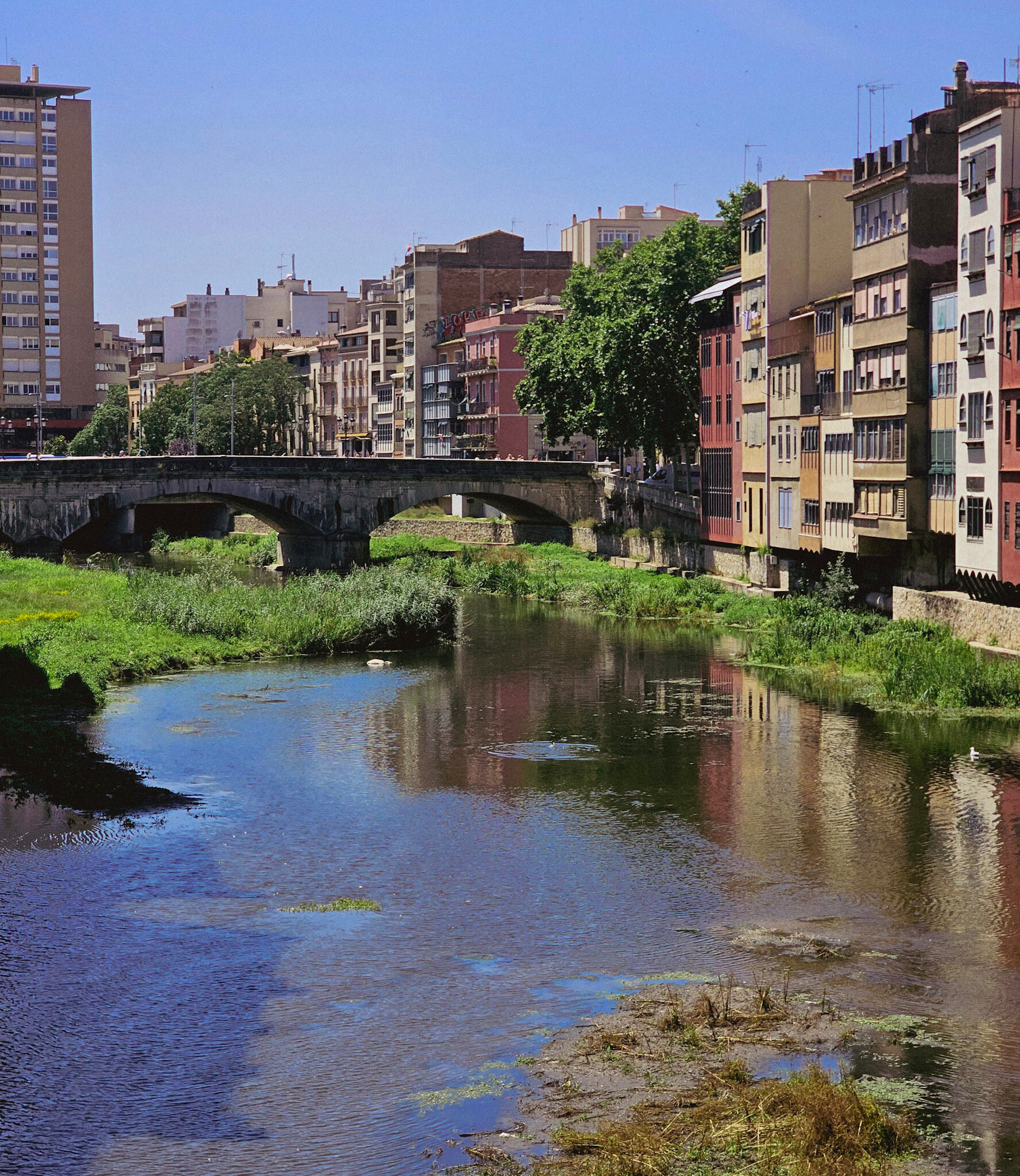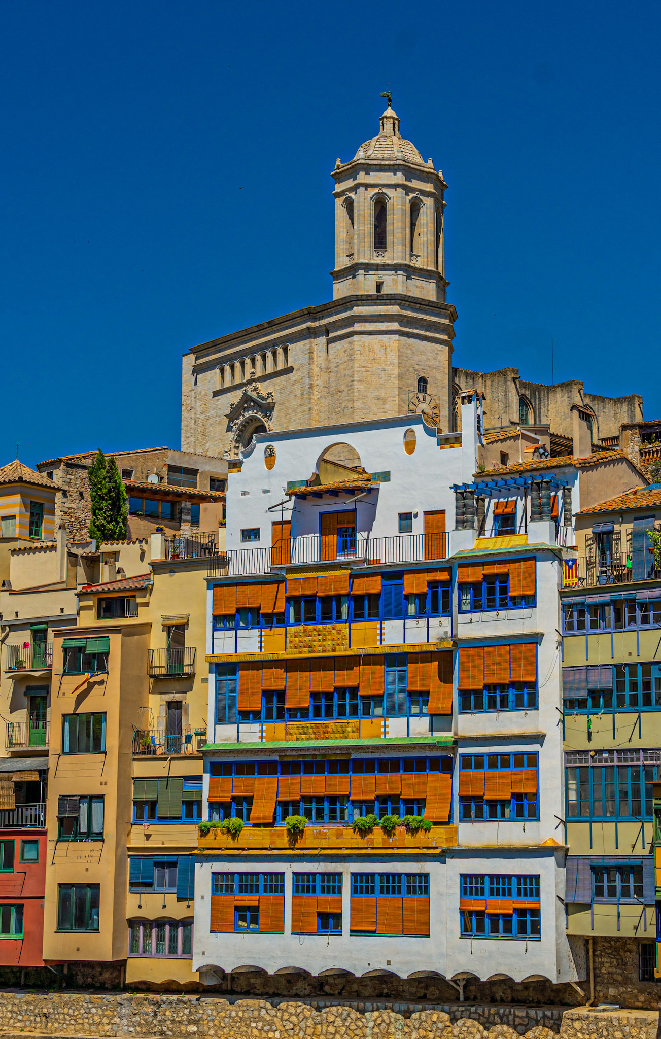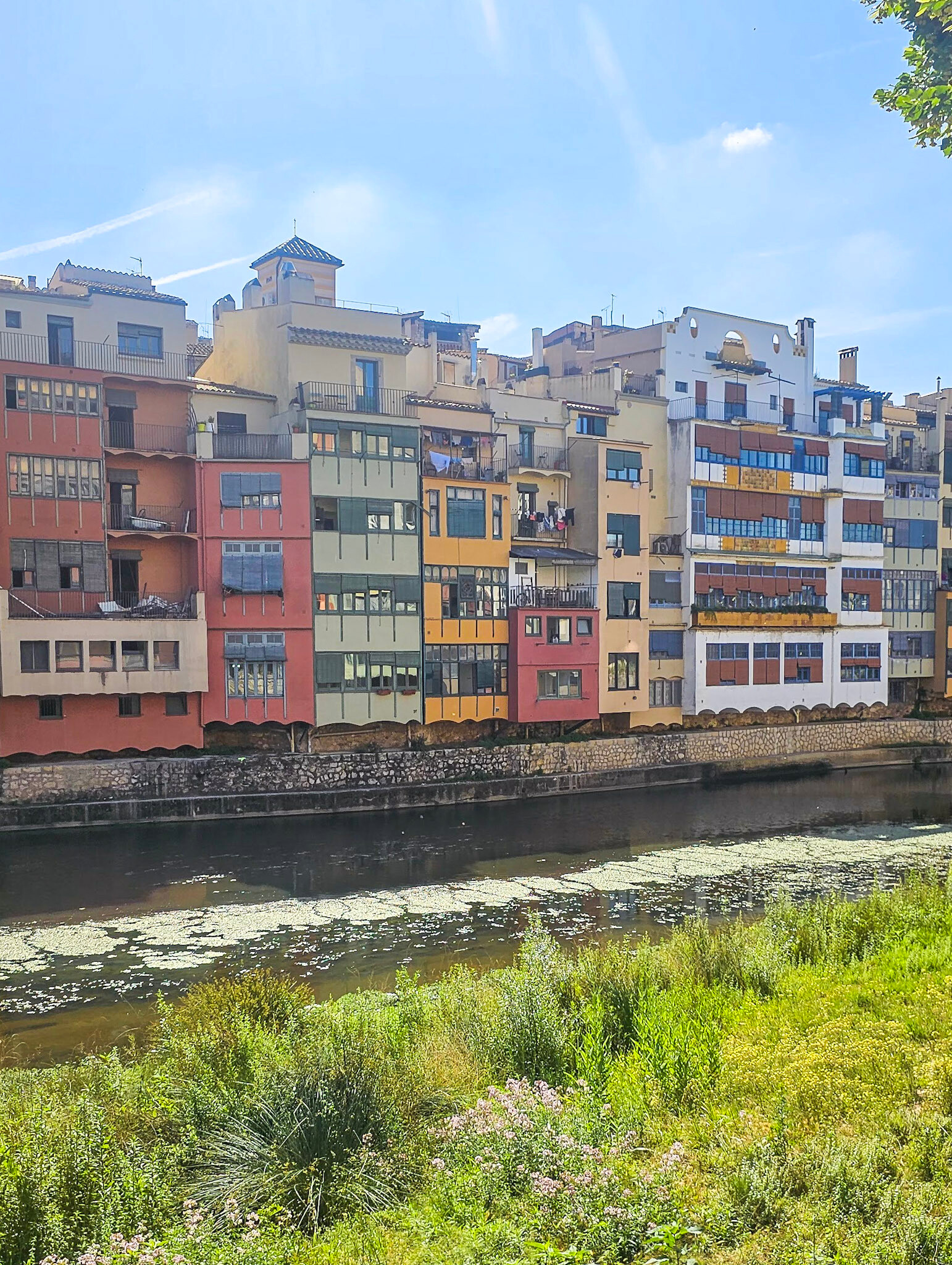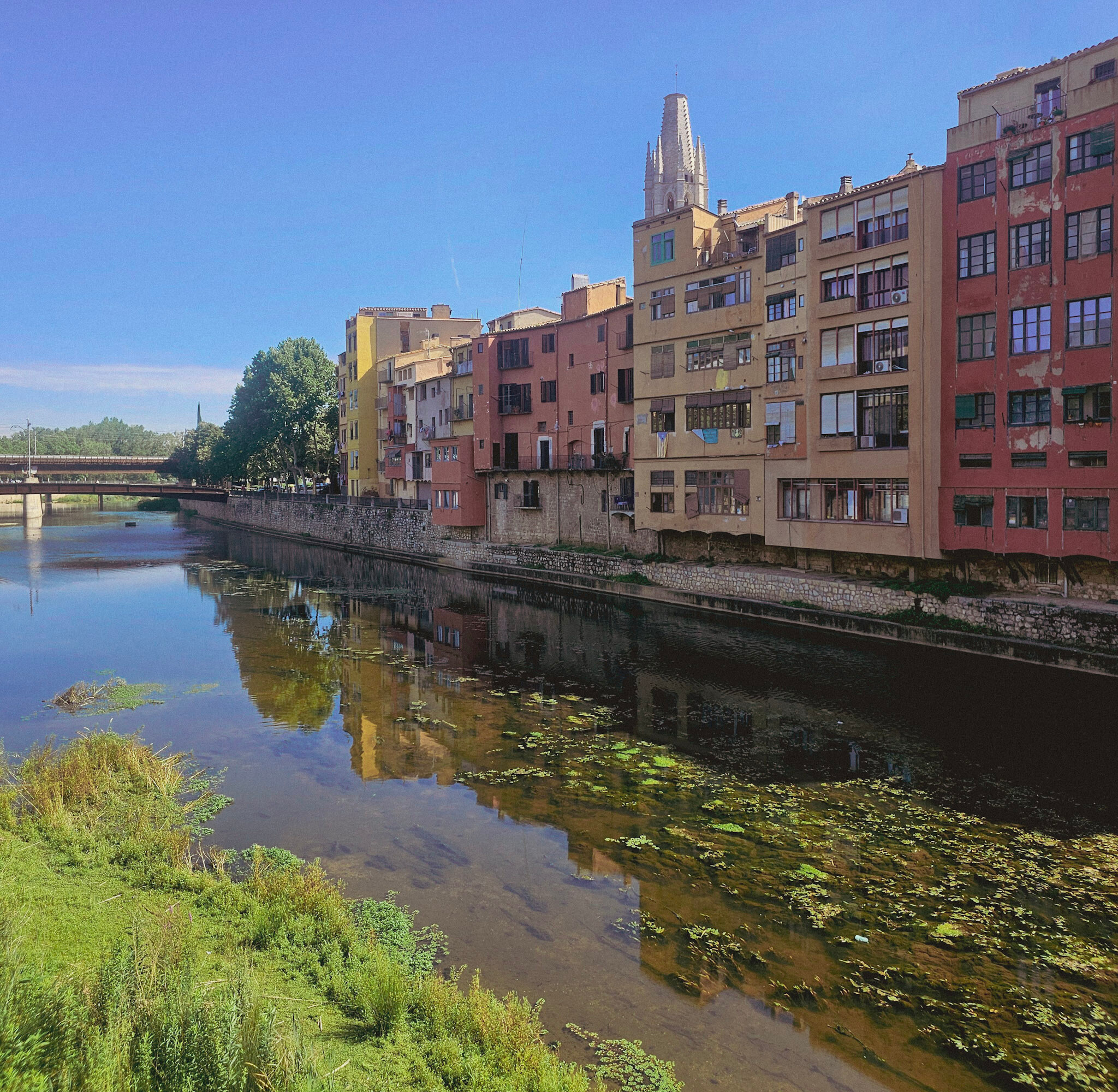 Za parkiem szybko dochodzimy do rzeki Onyar, gdzie Girona pokazuje swoją najbardziej charakterystyczną twarz, kolorowe domy stoją tu praktycznie nad samą wodą. Ich fasady są nierówne, trochę „posklejane”, ale właśnie to tworzy klimat, który można zobaczyć na pocztówkach, a w tle ponad dachami wyrasta wieża katedry. Dawniej były to zwykłe kamienice rzemieślników i kupców, dziś są jednym z symboli miasta. Przechodzimy przez wąski most, który prowadzi prosto w stronę starego miasta i daje jeden z najlepszych kadrów na całą zabudowę.