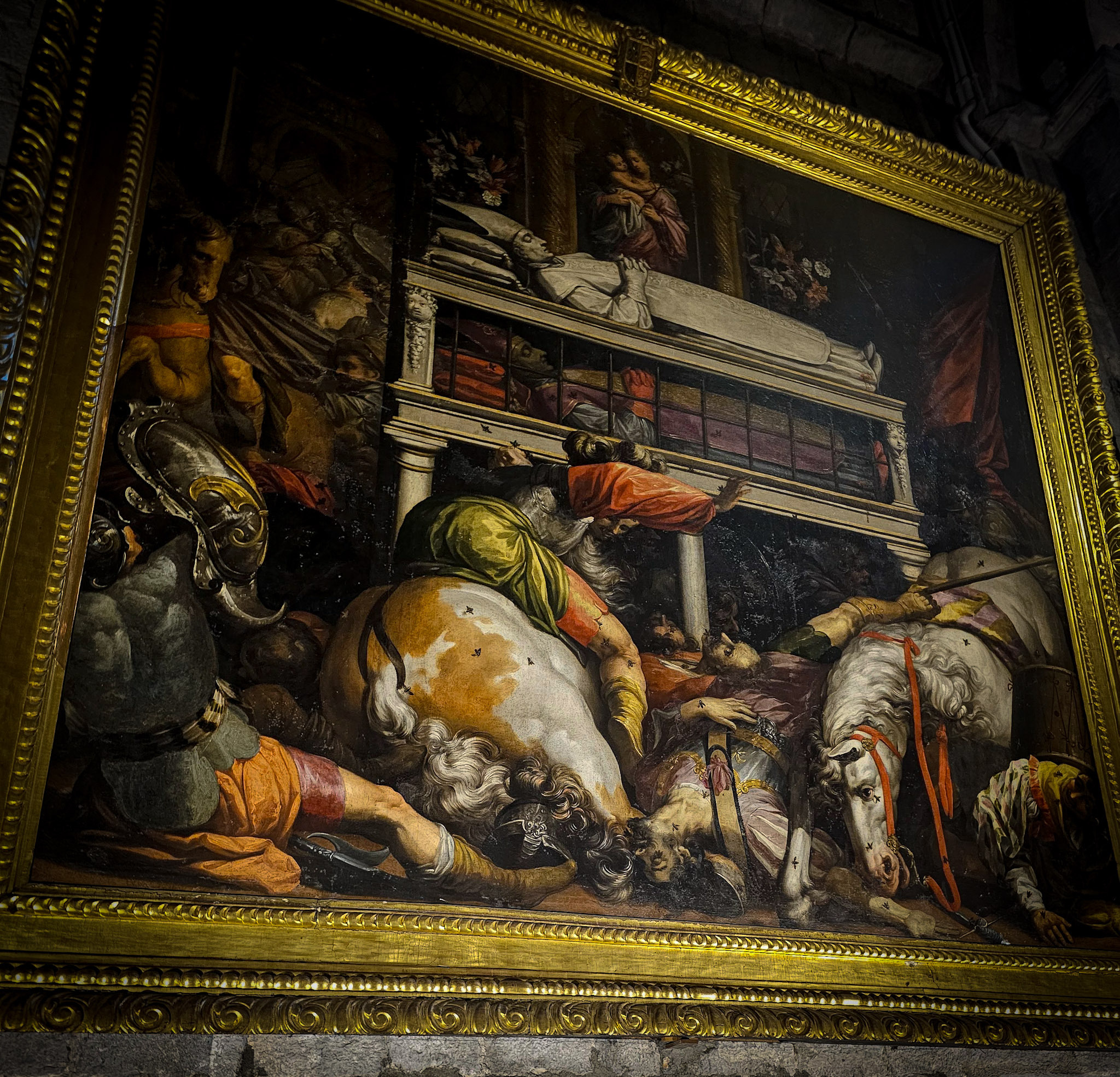 Powyżej fragment ołtarza z XVI wieku i jeden z obrazów autorstwa Joana de Borgonya, przedstawiające sceny z życia i męczeństwa św. Feliksa, patrona Girony.