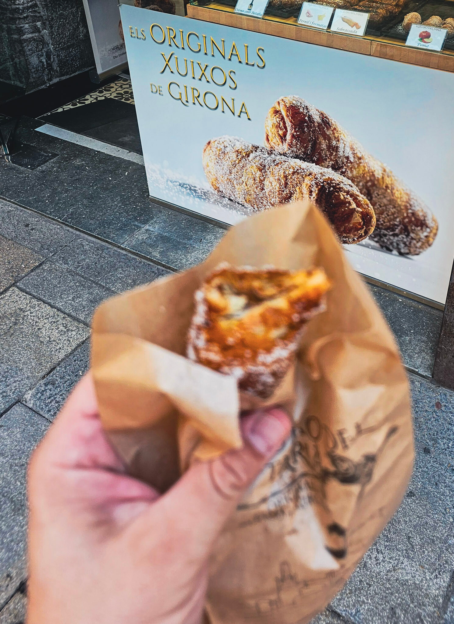 Tuż obok trafiamy na kultową cukiernię słynącą z xuixo lokalnego przysmaku z kremem, smażonego na głębokim tłuszczu i obsypanego cukrem. To jedno z tych miejsc, gdzie wchodzisz „na chwilę”, a wychodzisz z czymś na drogę i uśmiechem.