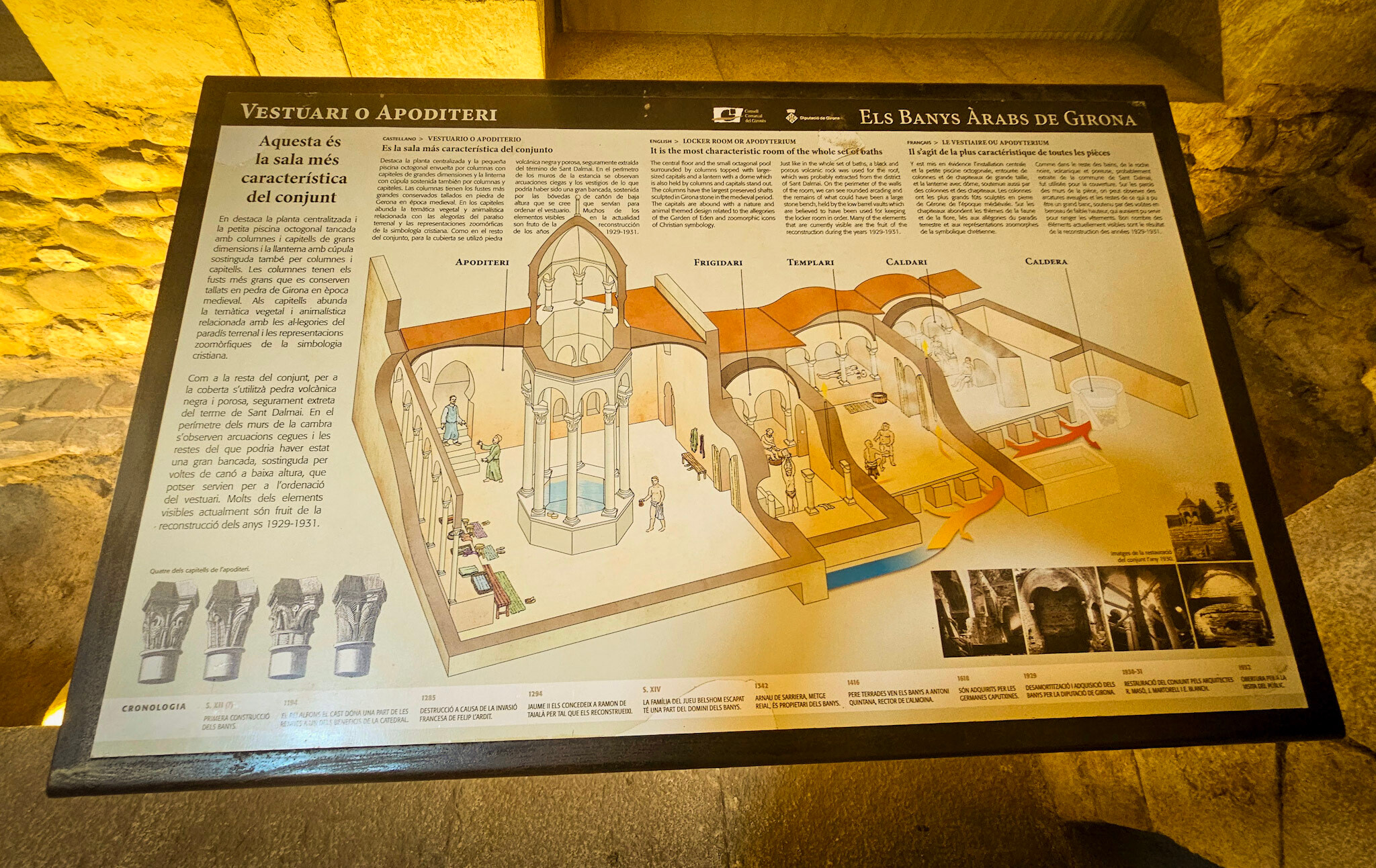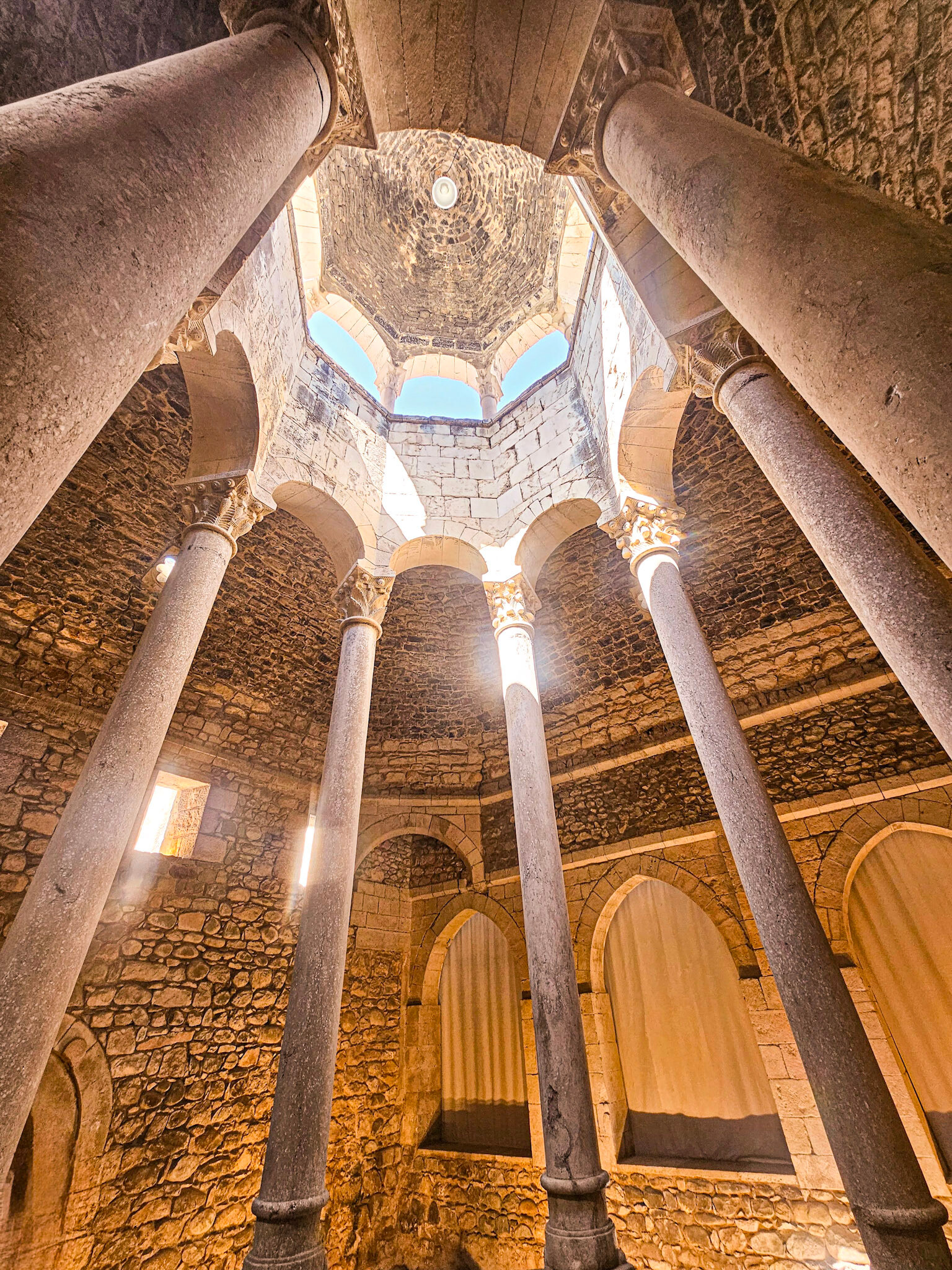 Następnie ruszamy w stronę Banys Àrabs w Gironie to jedne z najlepiej zachowanych średniowiecznych łaźni w Hiszpanii, choć wbrew nazwie nie są arabskie, a jedynie inspirowane stylem mauretańskim. Powstały w XII wieku na wzór rzymskich term i pełniły funkcję miejsca higieny, spotkań i odpoczynku. Cały układ opiera się na przechodzeniu przez kolejne pomieszczenia o różnej temperaturze, od chłodnych po gorące. Najbardziej charakterystyczna jest sala wejściowa z ośmiokątnym basenem i kolumnami pod kopułą, która wygląda jak żywcem wyjęta z innej epoki. To właśnie tu zaczynała się wizyta, coś na kształt dzisiejszej strefy relaksu. W kolejnych salach można zobaczyć, jak funkcjonował średniowieczny „system spa”, oparty na prostych, ale skutecznych rozwiązaniach. Łaźnie zostały częściowo zniszczone podczas wojen, a później odbudowane i przez wieki zmieniały swoje funkcje. Dopiero w XX wieku przywrócono im obecny wygląd i udostępniono zwiedzającym. Dziś nie są dużą atrakcją, ale mają niesamowity klimat i pozwalają poczuć historię bez tłumów. To miejsce bardziej do spokojnego przejścia i złapania atmosfery niż do długiego zwiedzania. Bilety 3€.