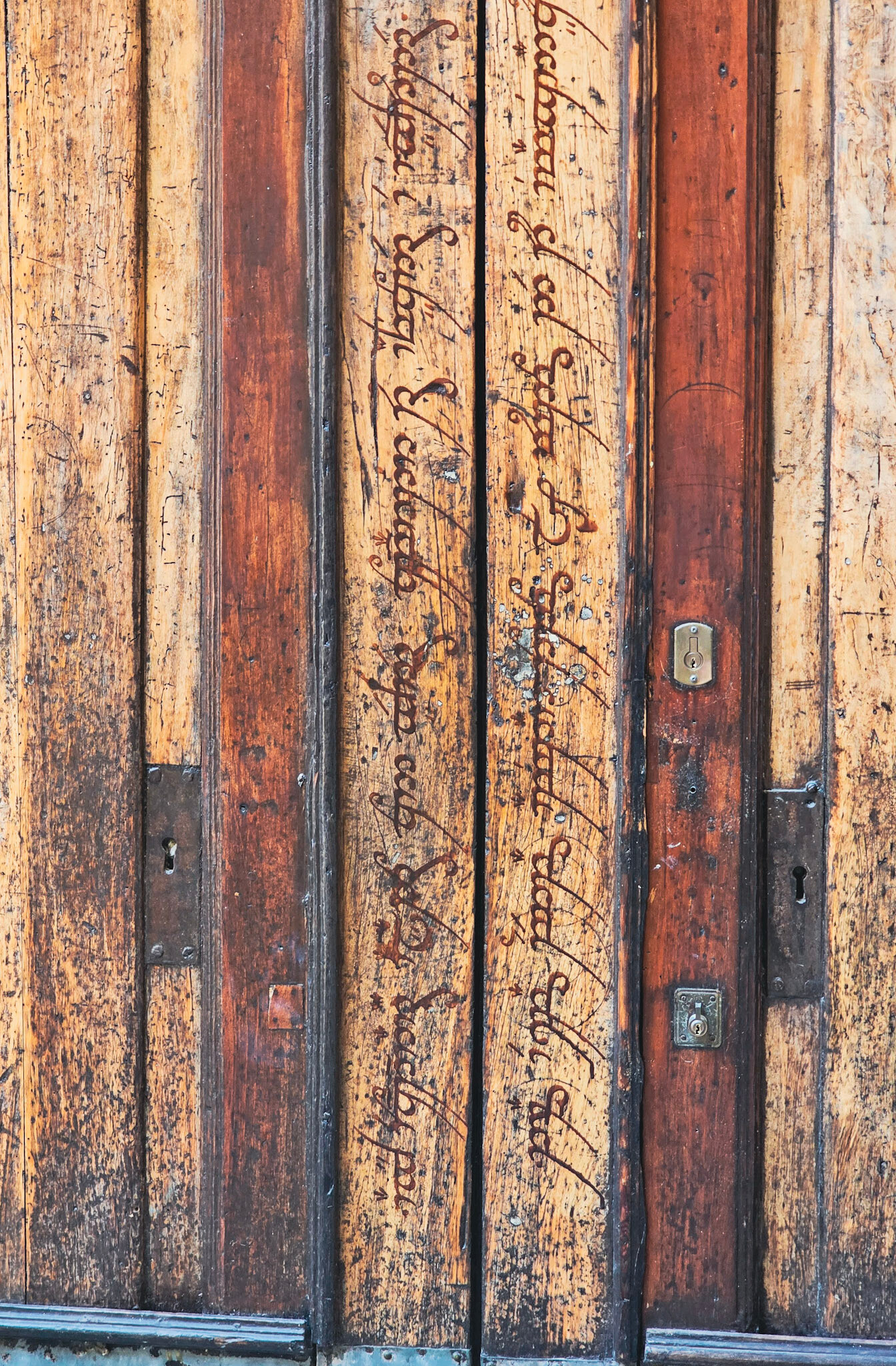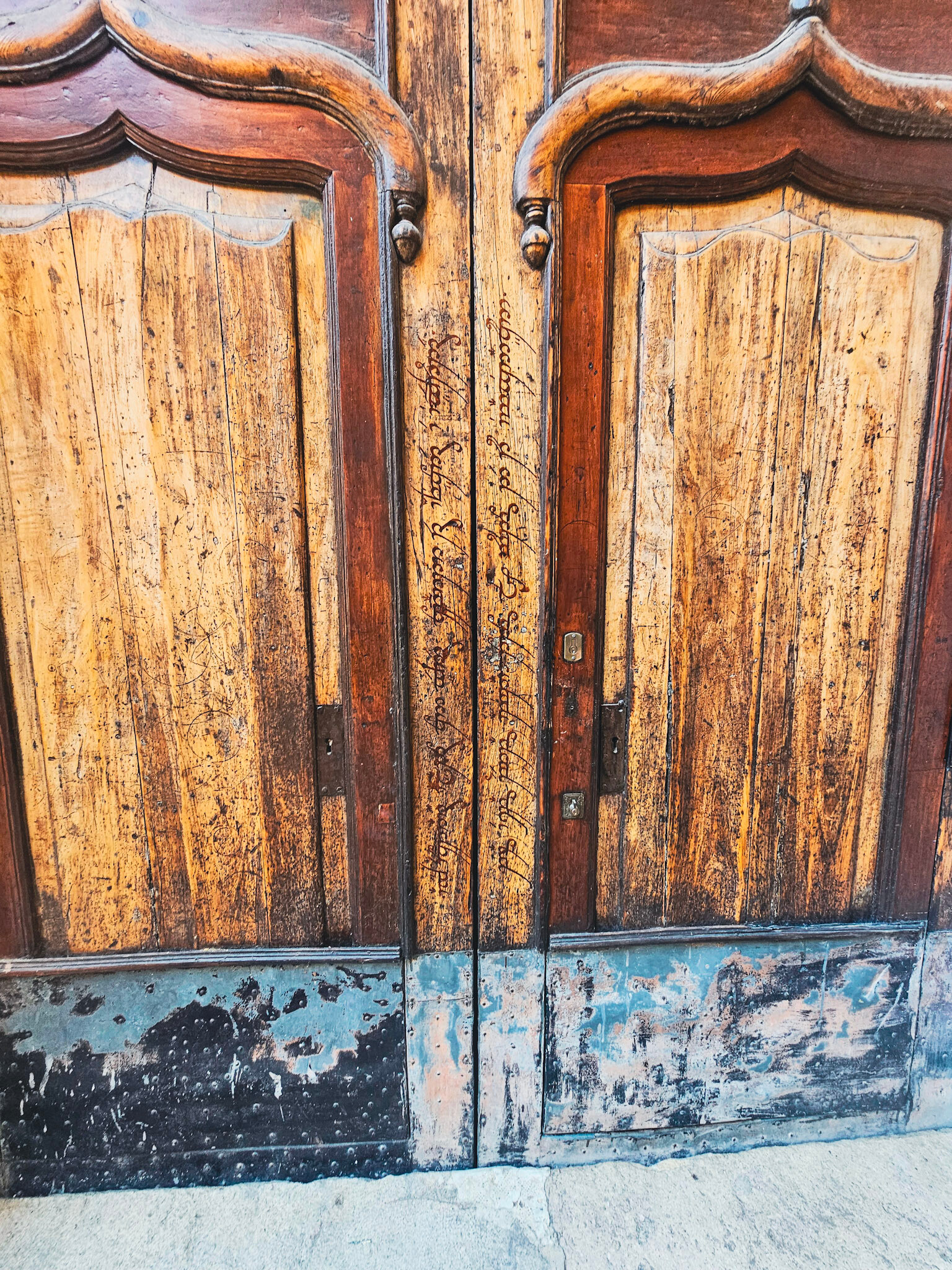 Po drodze trafiają się małe kościoły i niepozorne budynki z prostymi, romańskimi portalami, leniwie, bez biletów, za to z historią zapisaną w kamieniu. Wystarczy zejść z głównej trasy, żeby znaleźć detale, które robią klimat: stare drewniane drzwi, przetarte przez czas, z wyblakłą farbą i odręcznymi napisami, które wyglądają jak ślady po dawnych mieszkańcach. To trochę jak kronika miasta zapisana nie w muzeum, tylko na zwykłych ścianach i wejściach do domów.