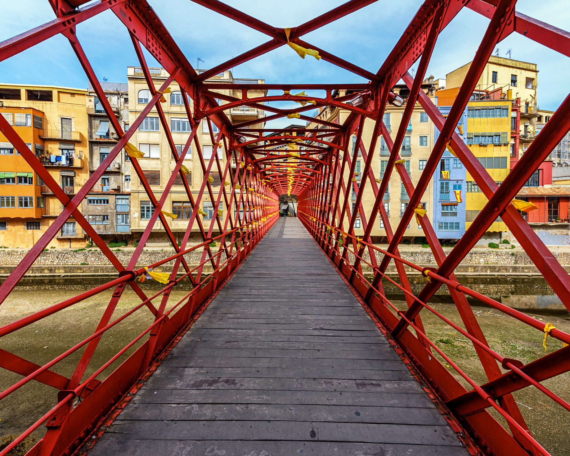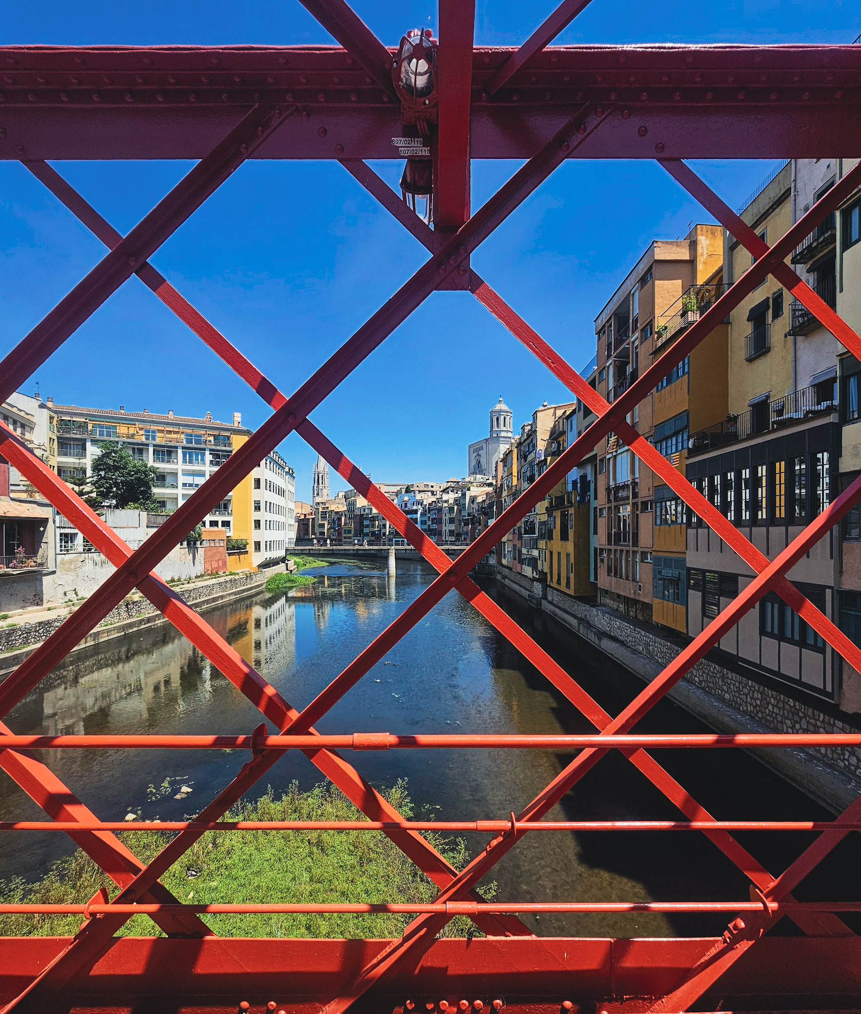 I nagle, po tym całym średniowiecznym klimacie, wychodzimy prosto na coś zupełnie innego, czerwony most, który wygląda jak żywcem wyjęty z innej epoki. Pont de les Peixateries Velles, czyli słynny most Eiffla, to żelazna konstrukcja zaprojektowana jeszcze przed wieżą w Paryżu przez firmę Gustave Eiffel. Czerwona stalowa kratownica tworzy charakterystyczny tunel, po zejściu przez most warto się na chwilę zatrzymać i po prostu popatrzeć na odbicia w wodzie kolorowych domów, na detale fasad i na wieżę katedry wystającą ponad dachy.
