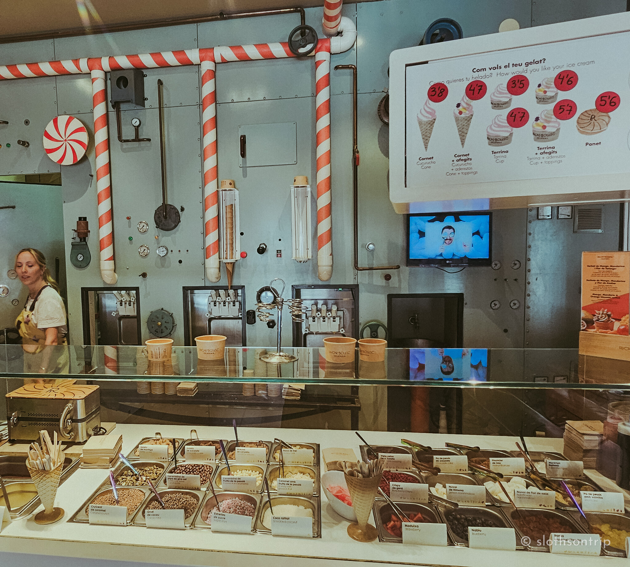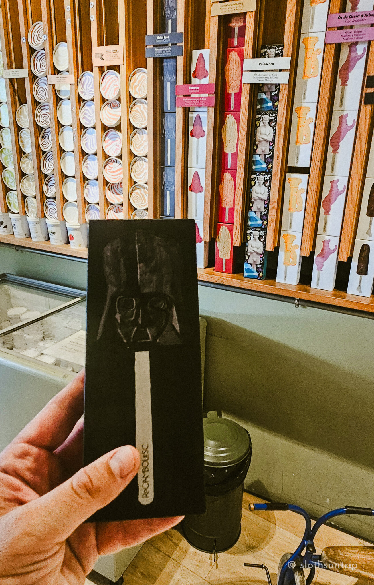 Po drodze na stare miasto robimy jeszcze jeden przystanek w Rocambolesc Gelateria, które na pierwszy rzut oka wygląda jak zwykła lodziarnia, ale szybko okazuje się czymś dużo więcej. To miejsce stworzył Jordi Roca, więc zamiast klasycznych lodów dostajemy małe dzieła sztuki w rożku. W środku jest trochę jak w cukierniczym laboratorium Williego Wonki maszyny, kolory i dziesiątki dodatków, które bardziej przypominają fine dining niż uliczny deser. Wybieramy coś prostego, ale i tak kończy się na rożku, który wygląda jak z Instagrama i smakuje jeszcze lepiej niż wygląda. Jako fan Gwiezdnych Wojen nie mogłem się powstrzymać i spałaszowałem jeszcze lodową wersję Dartha Vadera. Z takim deserem w ręku Girona smakuje jeszcze lepiej.