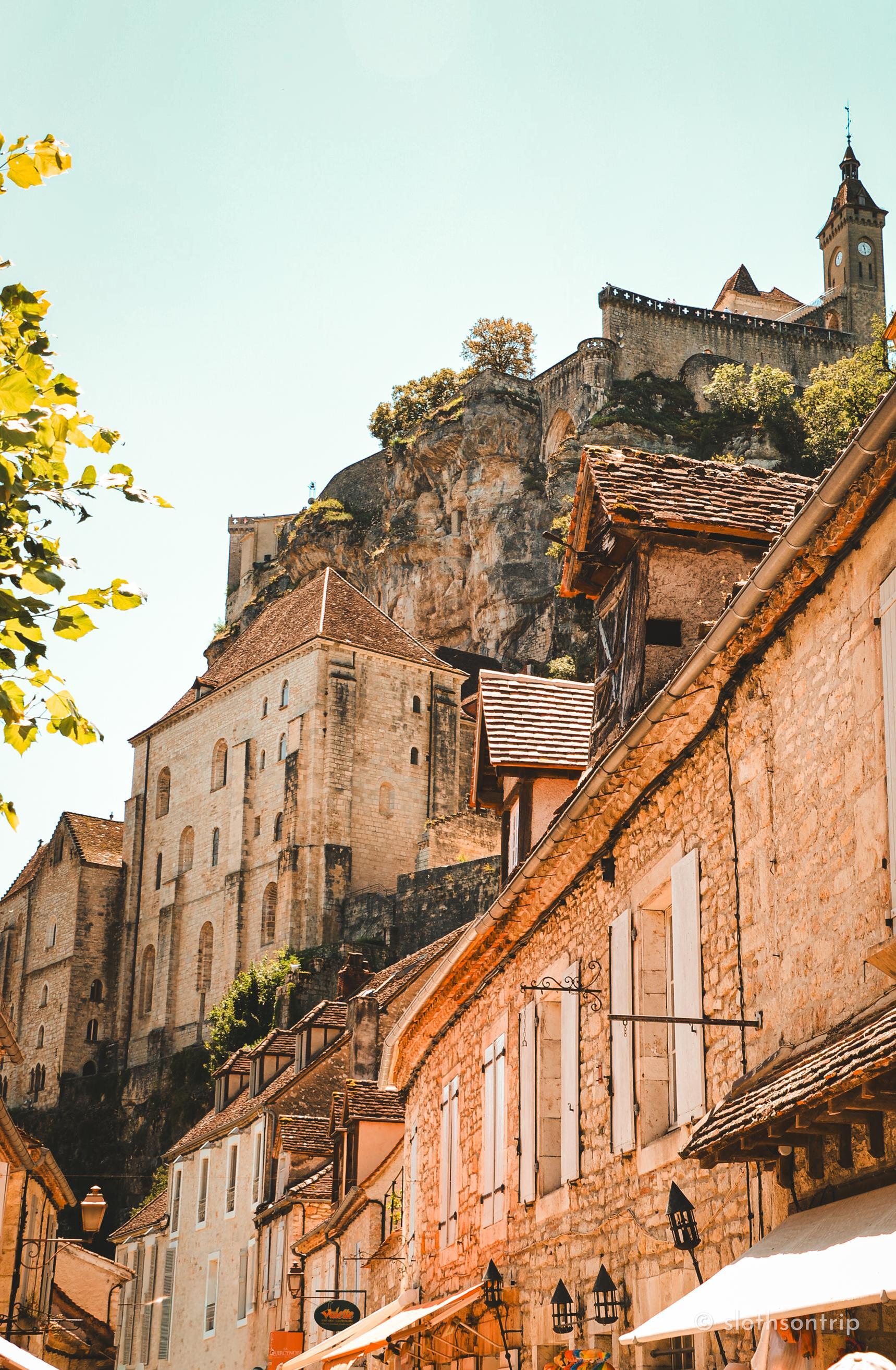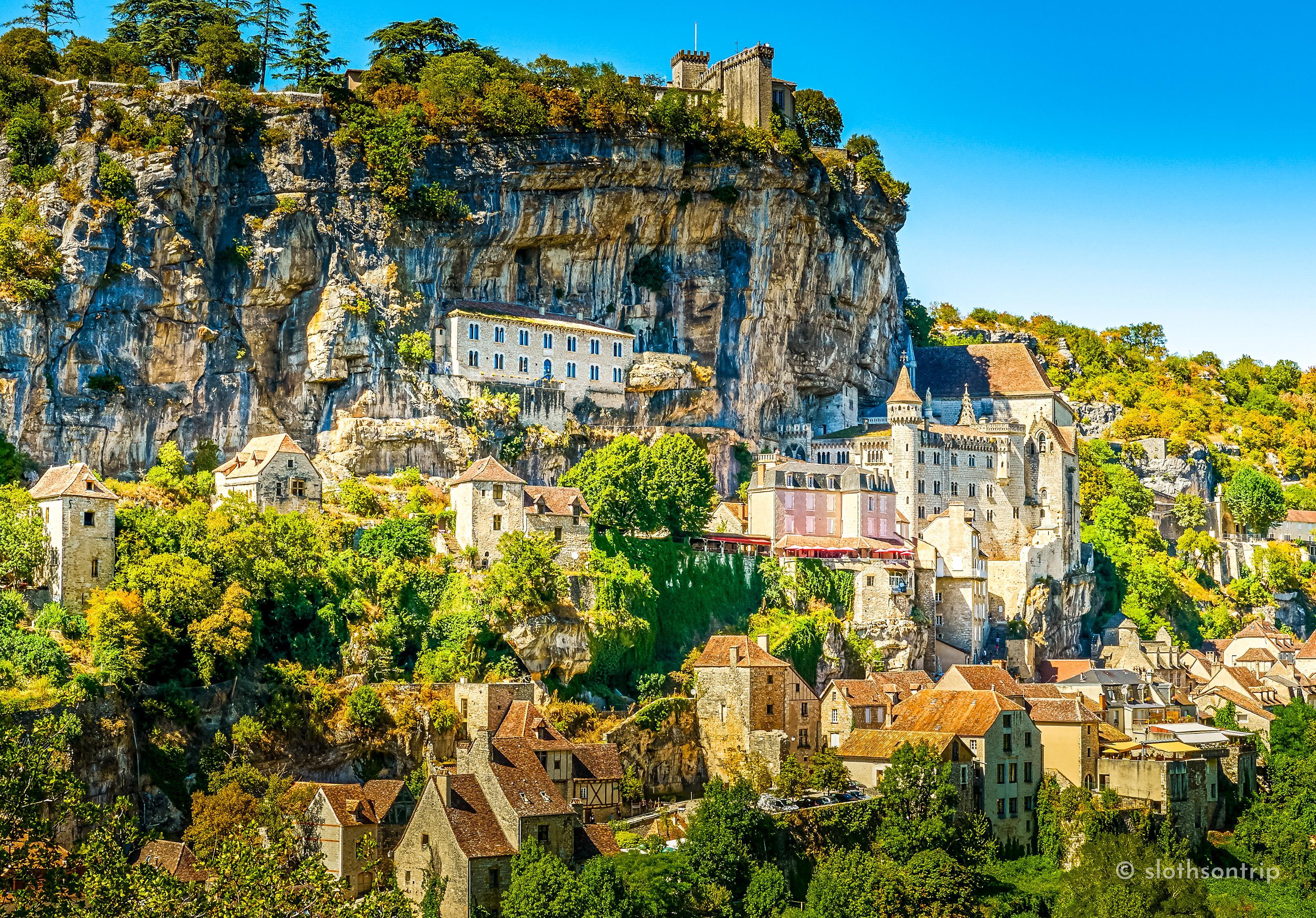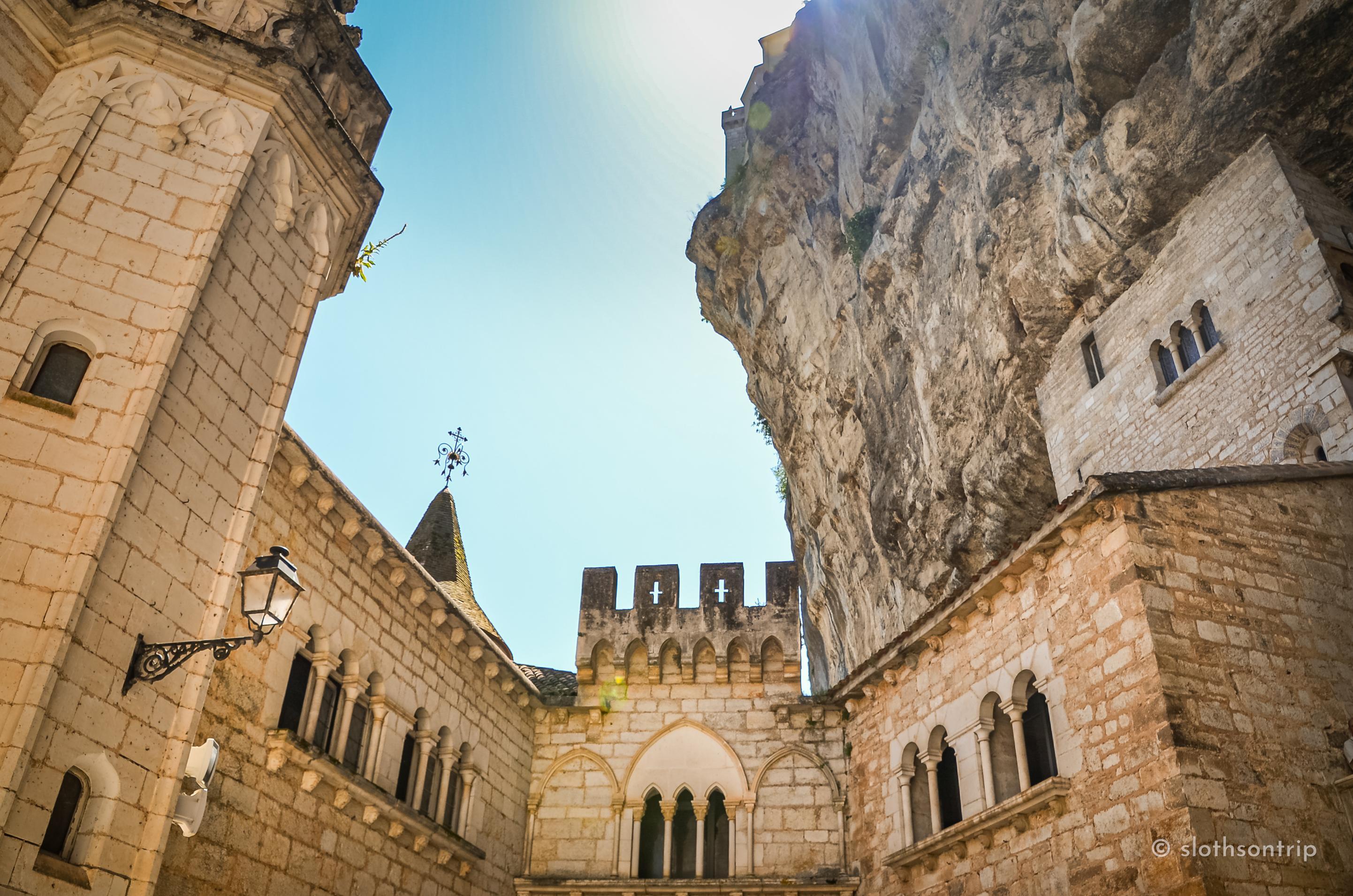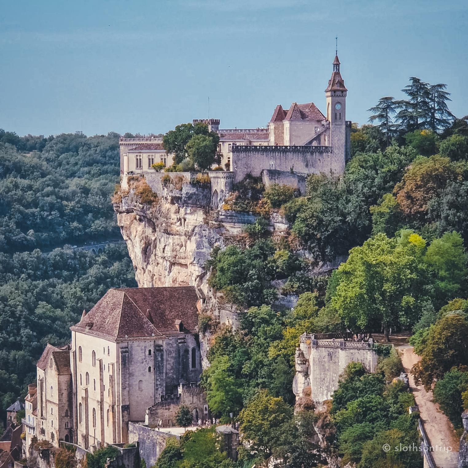 Pod skałą płynie wąską doliną Alzou, a nad nią piętrzy się Rocamadour – jak kamienny tort ułożony z kaplic, klasztoru i domów, które wyglądają, jakby od wieków trzymały się skały siłą wiary. Według legendy to właśnie tutaj pustelnik św. Amadour znalazł swoje schronienie.