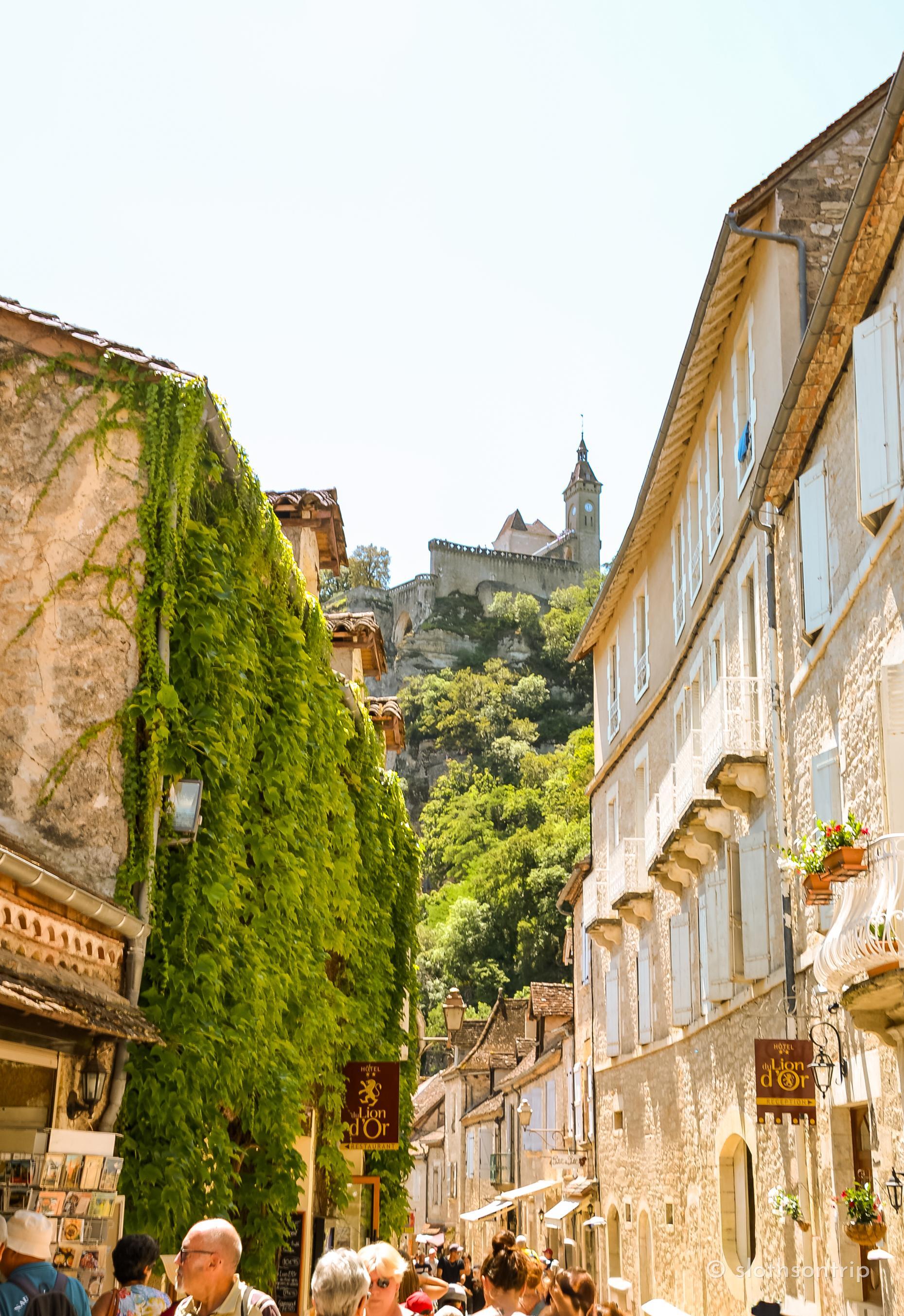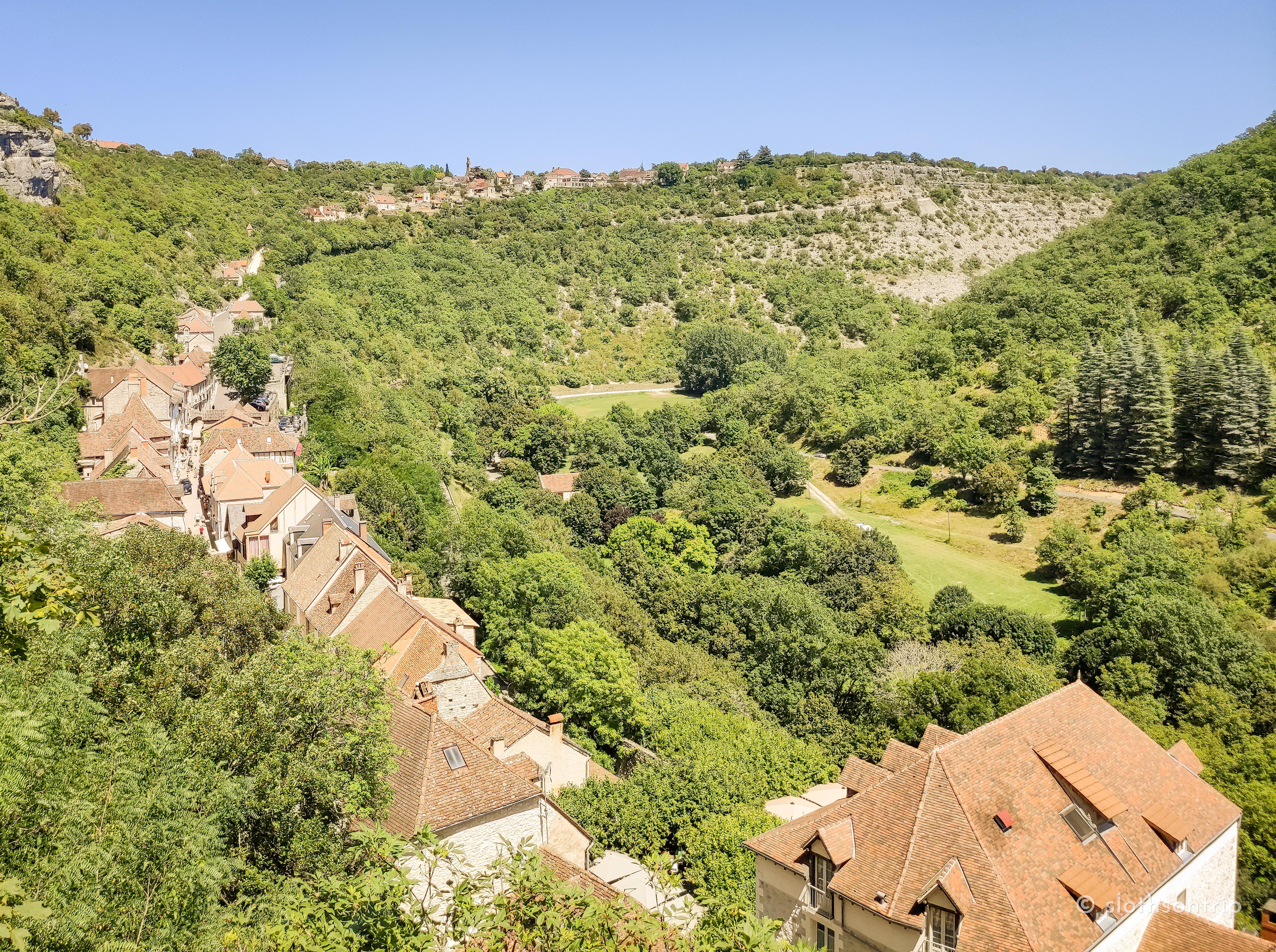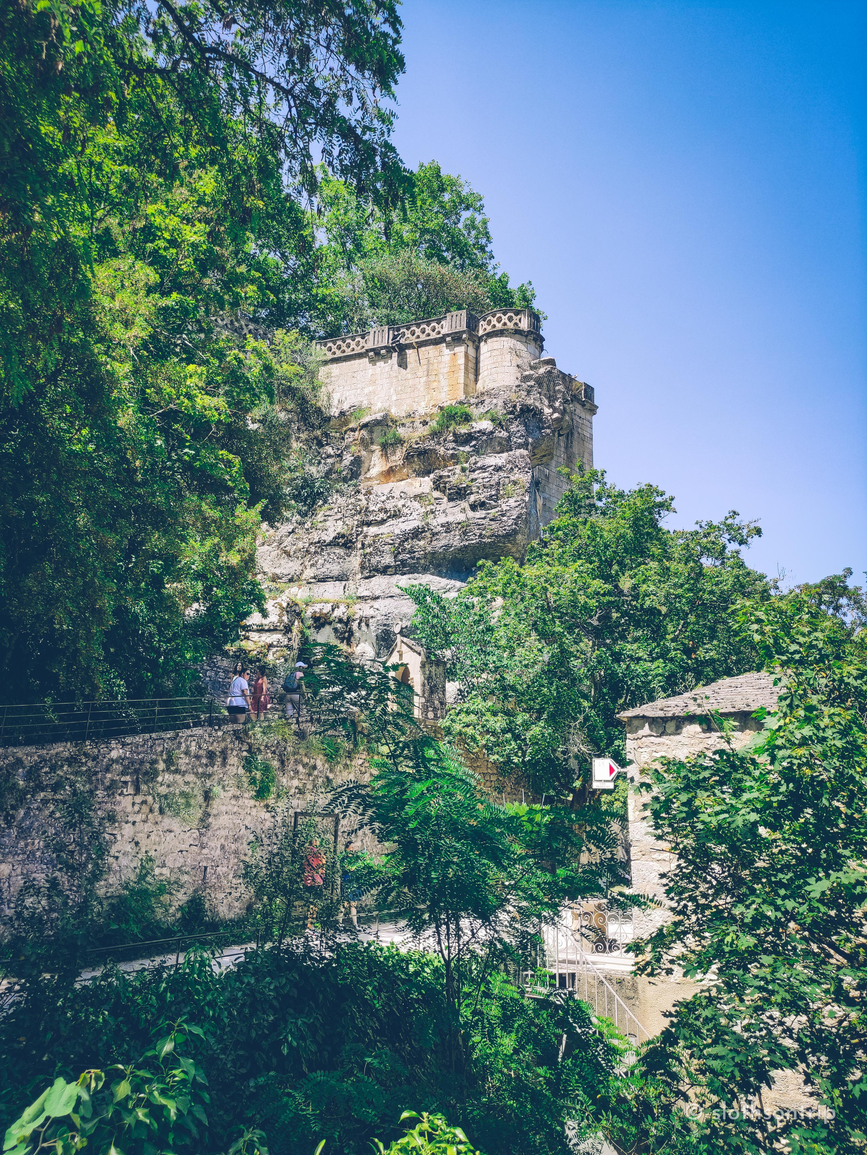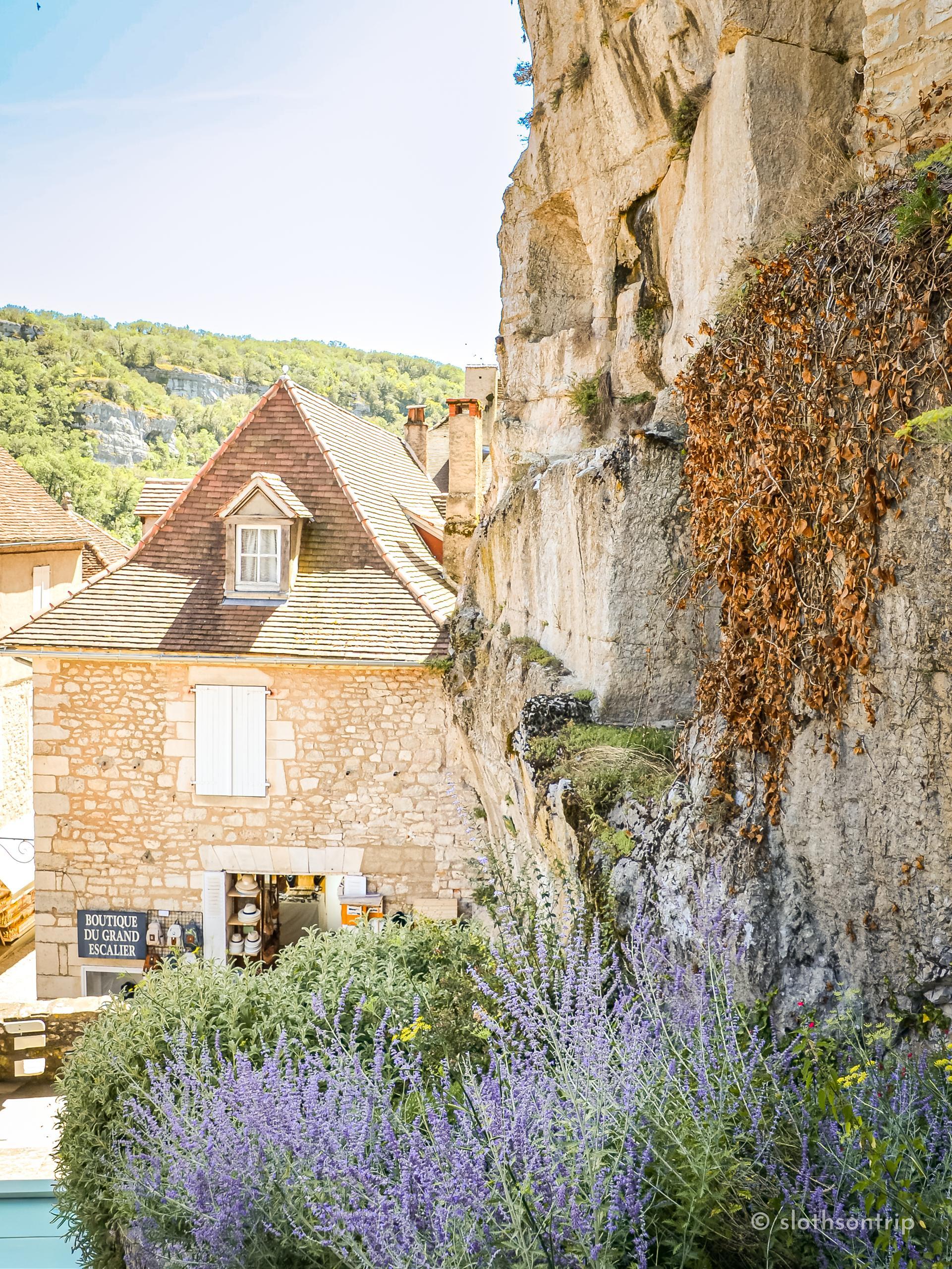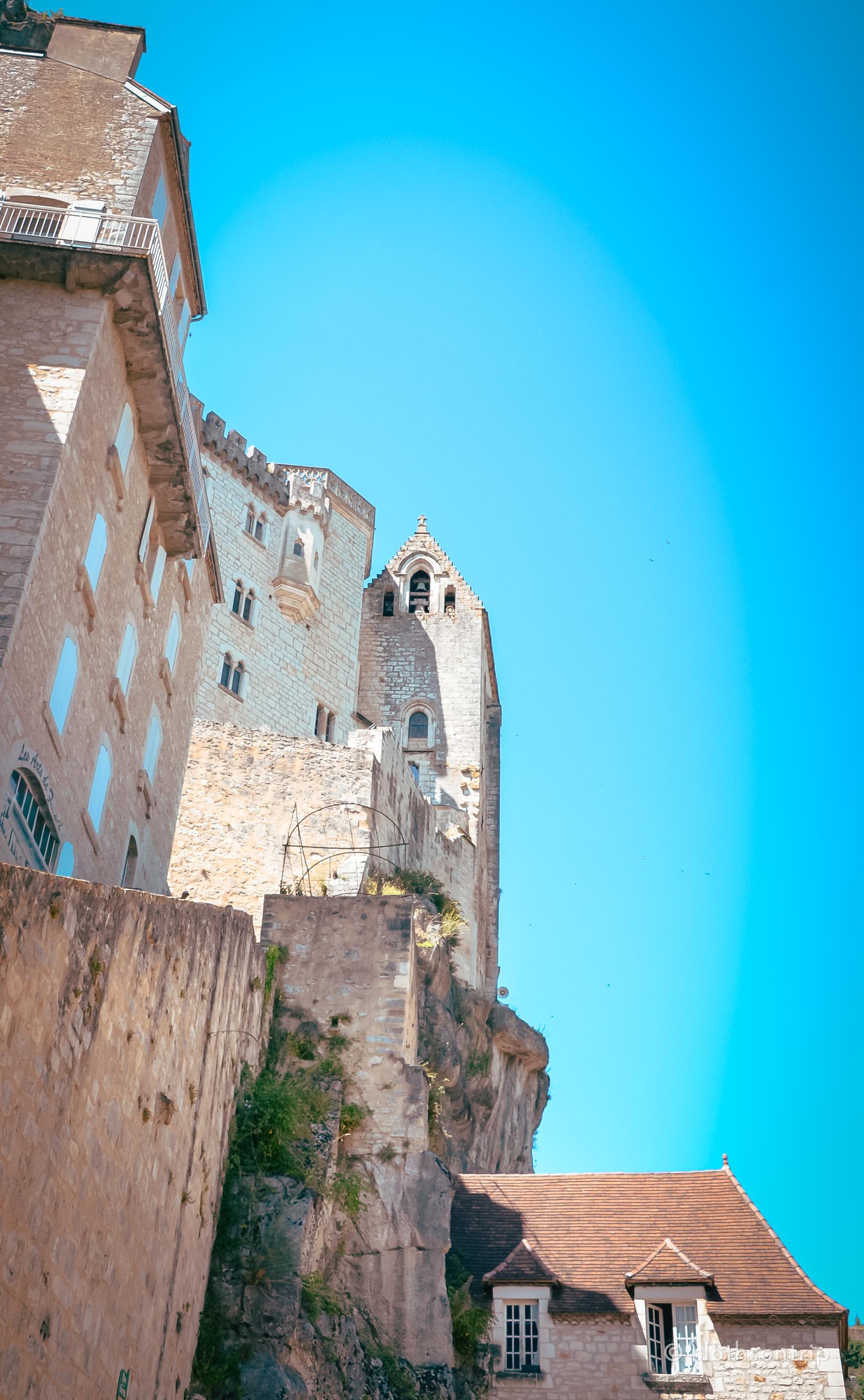Pod skałą płynie wąską doliną Alzou, a nad nią piętrzy się Rocamadour – jak kamienny tort ułożony z kaplic, klasztoru i domów, które wyglądają, jakby od wieków trzymały się skały siłą wiary. Według legendy to właśnie tutaj pustelnik św. Amadour znalazł swoje schronienie.