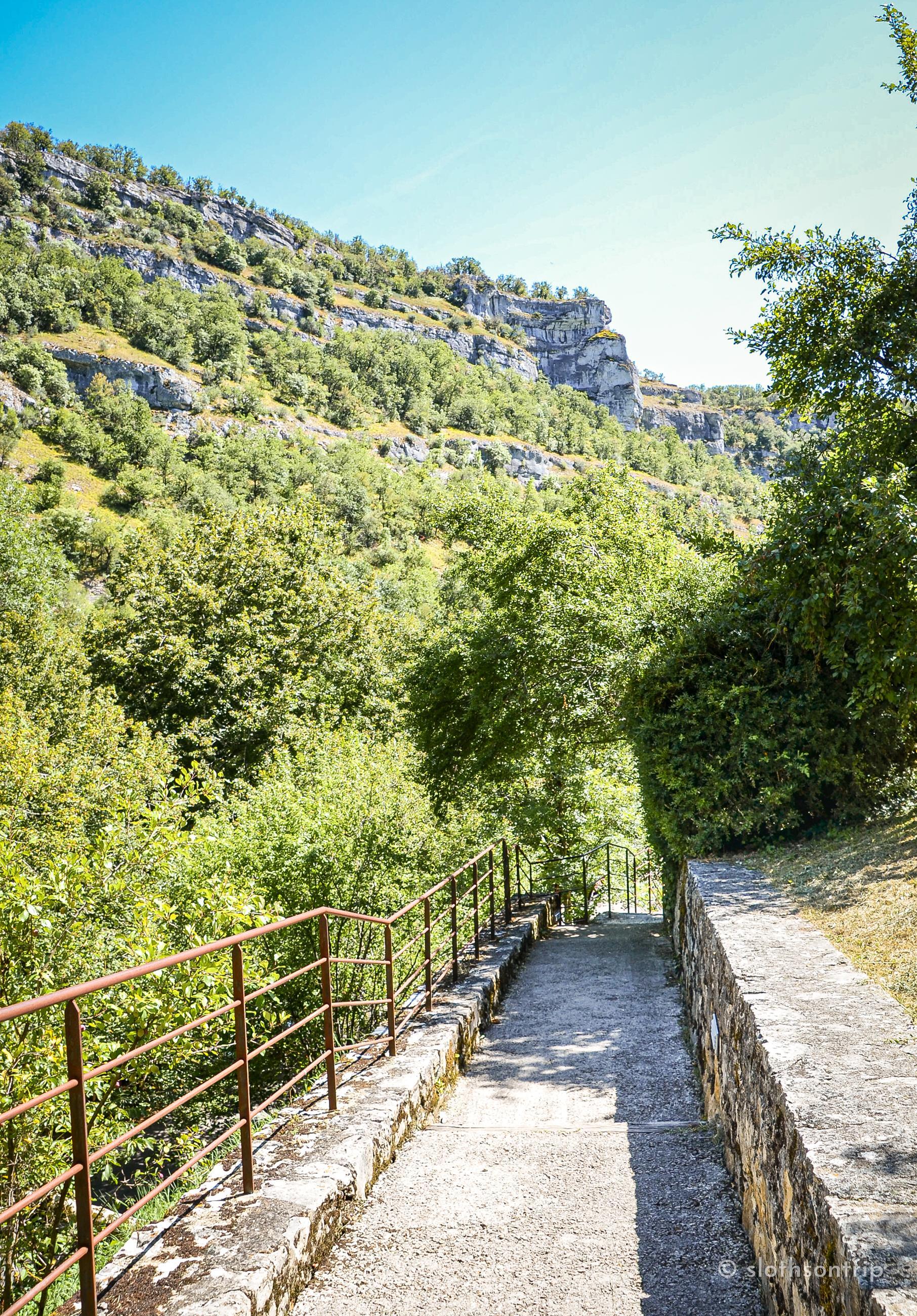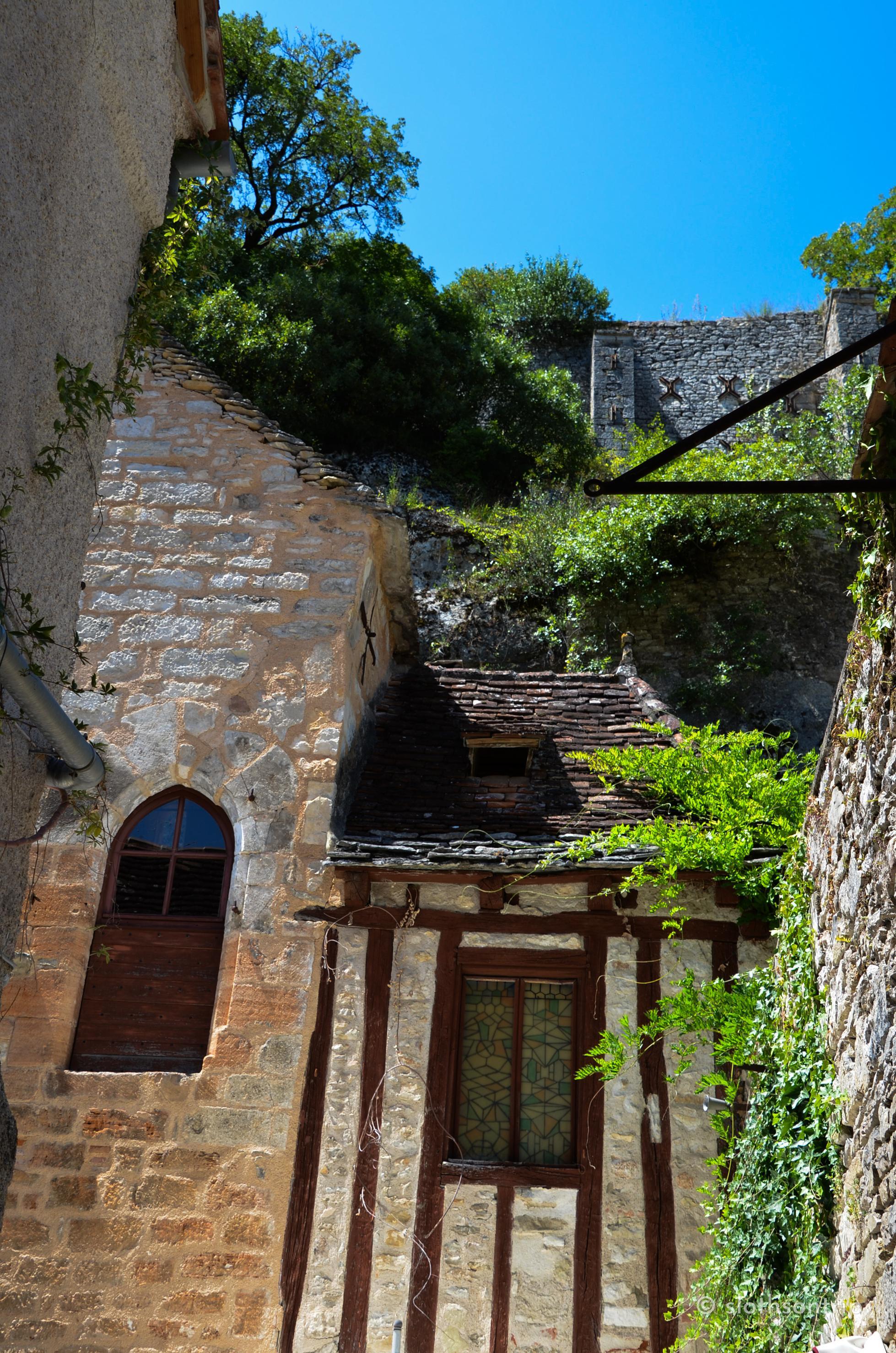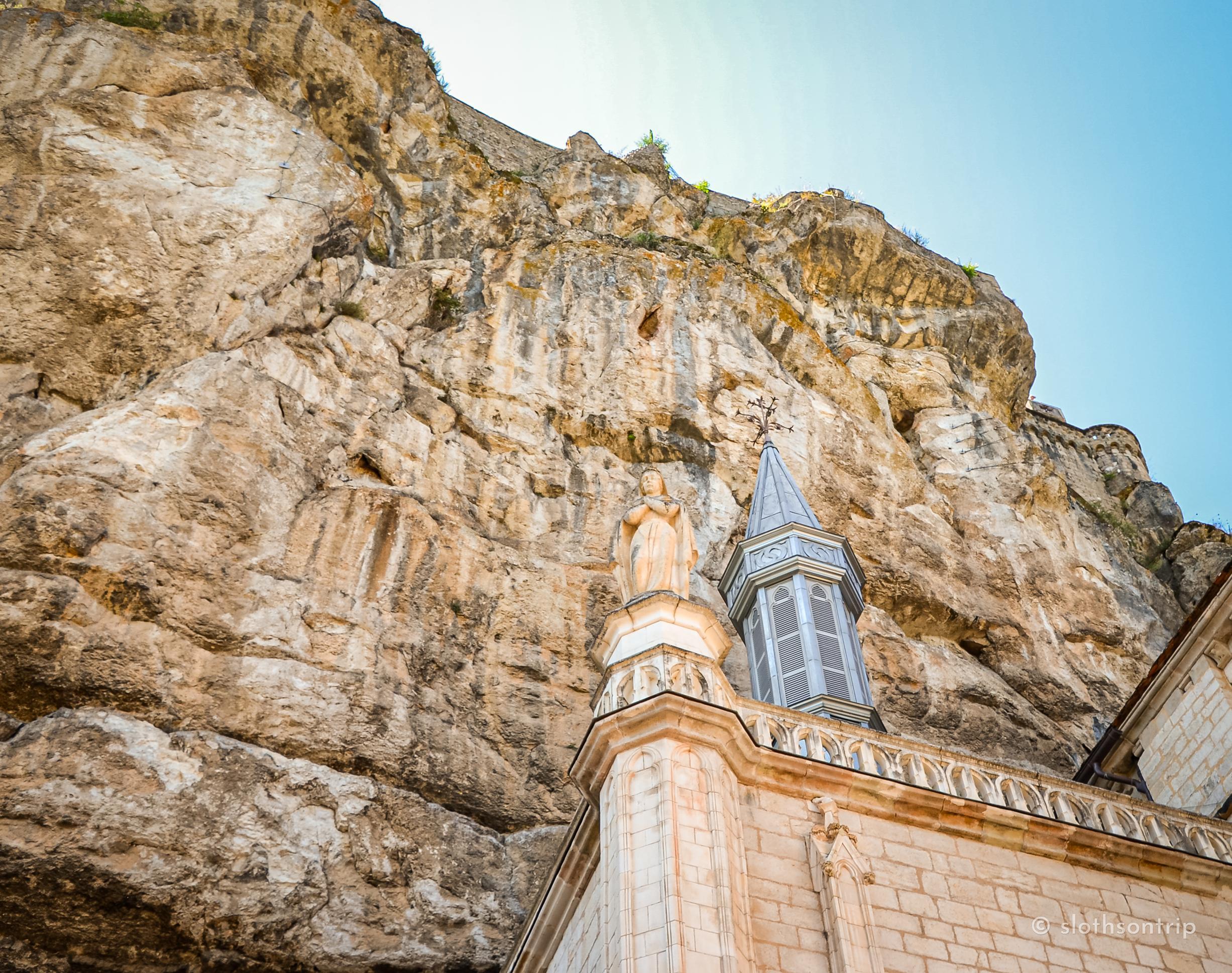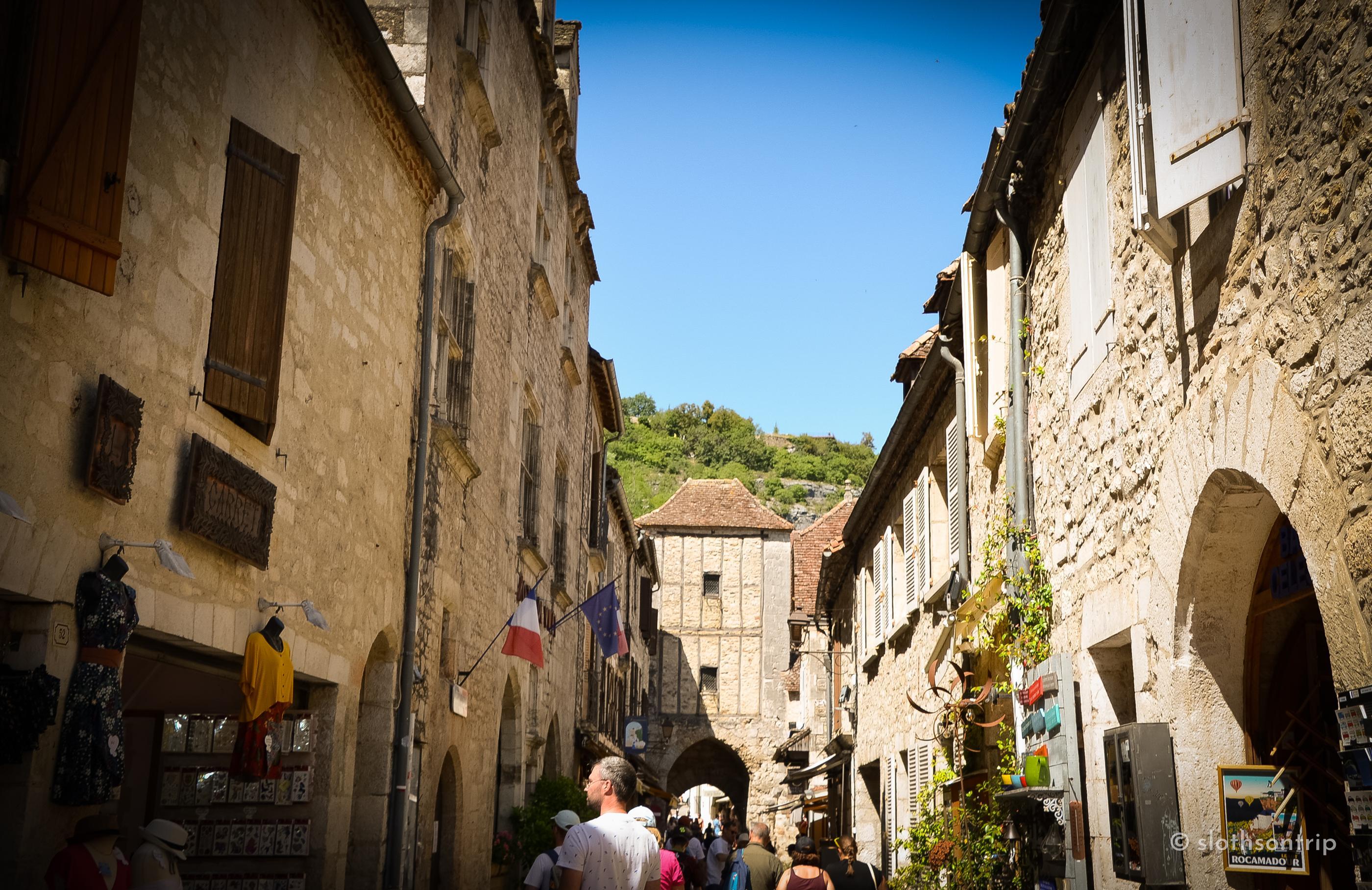 Pod skałą płynie wąską doliną Alzou, a nad nią piętrzy się Rocamadour – jak kamienny tort ułożony z kaplic, klasztoru i domów, które wyglądają, jakby od wieków trzymały się skały siłą wiary. Według legendy to właśnie tutaj pustelnik św. Amadour znalazł swoje schronienie.