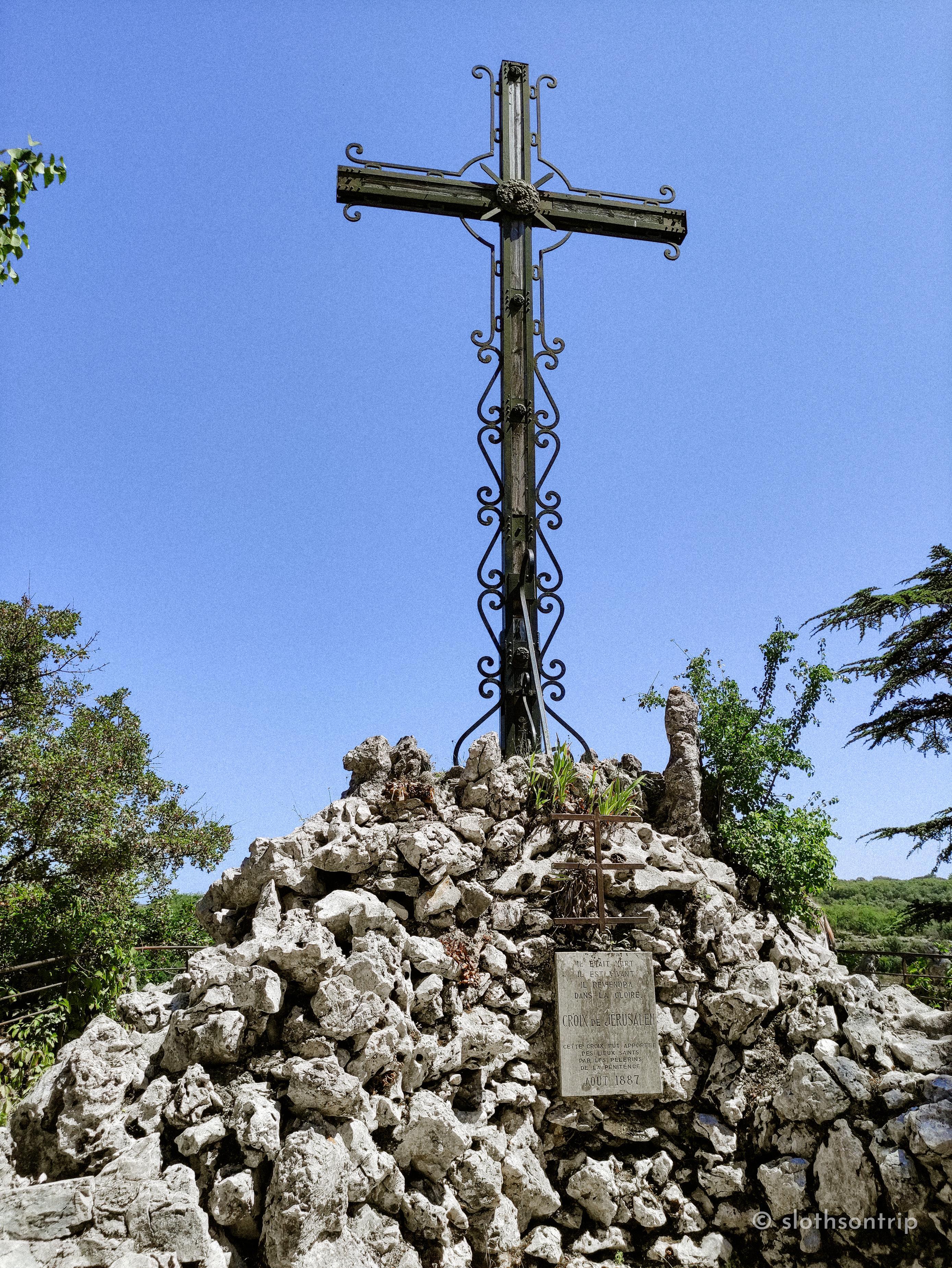 Po drodze mijamy stacje drogi krzyżowej, małe kapliczki wtopione w skałę, a dalej grotę z ołtarzem, gdzie pielgrzymi zatrzymują się na chwilę ciszy. Im wyżej, tym widok coraz szerszy – aż w końcu docieramy na szczyt, gdzie stoi krzyż górujący nad doliną Alzou, jakby pilnował całego Rocamadour od setek lat.